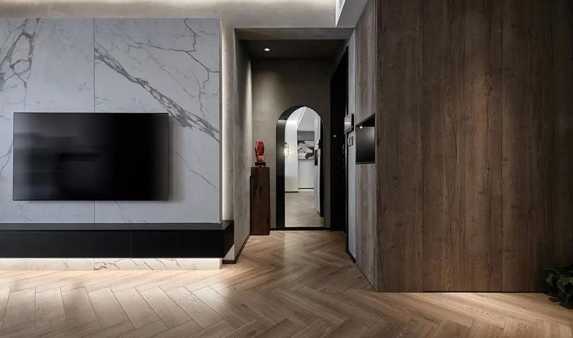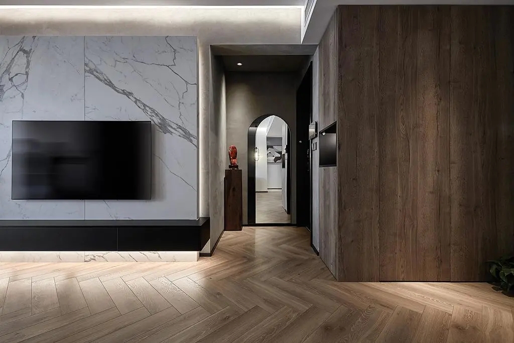 微微昏暗的光源,增加了入戶后對于整個起居室的心理延展性。一面立體感的穿衣鏡是整個房間的開始,但遠遠還未結束。水泥涂料在玄關的運用看上去粗獷,觸手卻冰涼細膩,涂料的質感讓墻面對燈光的反應與眾不同。