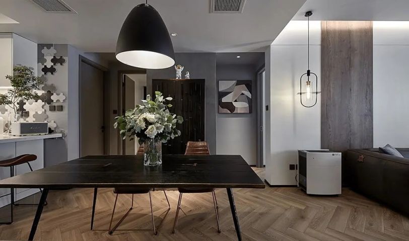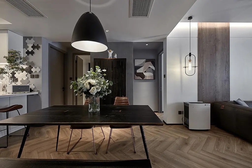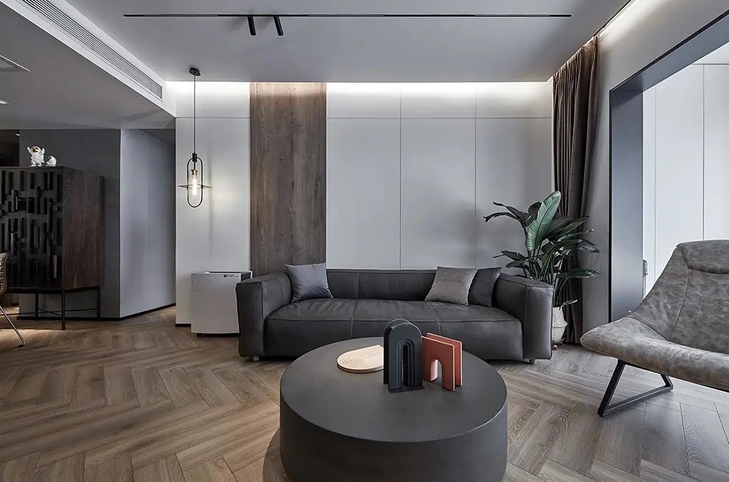 客廳整體采用極簡復古風格,人字拼的復合地板給家具和裝飾品提供了一個有層次感的背景。水泥灰墻面、巖灰色沙發(fā)、水泥色茶幾點綴上一圈金色,硬朗與柔美共存,沉淀出厚重的氣息。在喧囂都市里,讓家里的顏色沉靜下來,也給內心騰出一片清靜凈土,休整后迎接新一天的整裝待發(fā)。