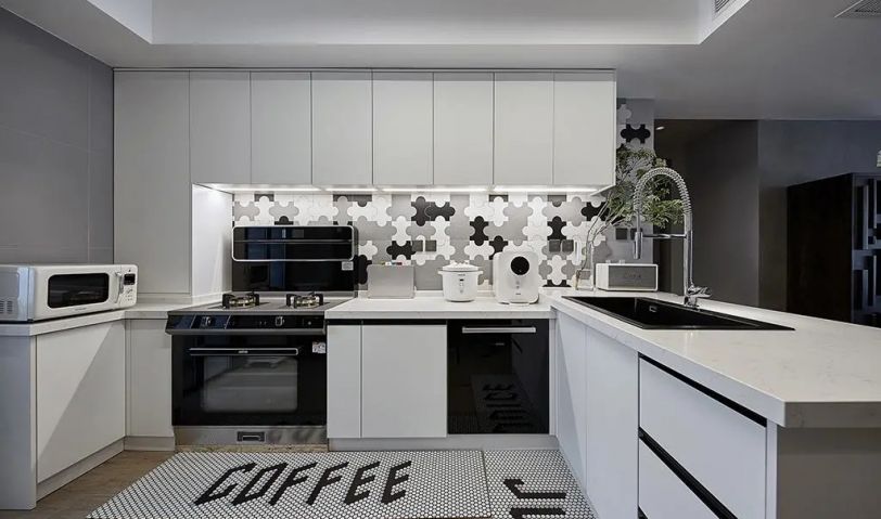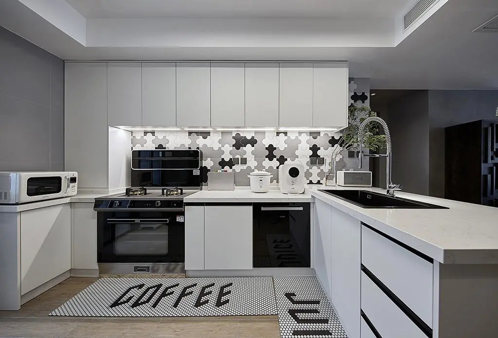 經典的黑白灰色調之外,墻磚、地毯的點綴讓充滿煙火氣的廚房變得俏皮可愛起來;在有限的空間里,集成灶、烤箱、洗碗機、感應燈、垃圾處理器、抽拉式水龍頭等廚房配件的加入也讓烹飪成為了一件省心有趣的日常。