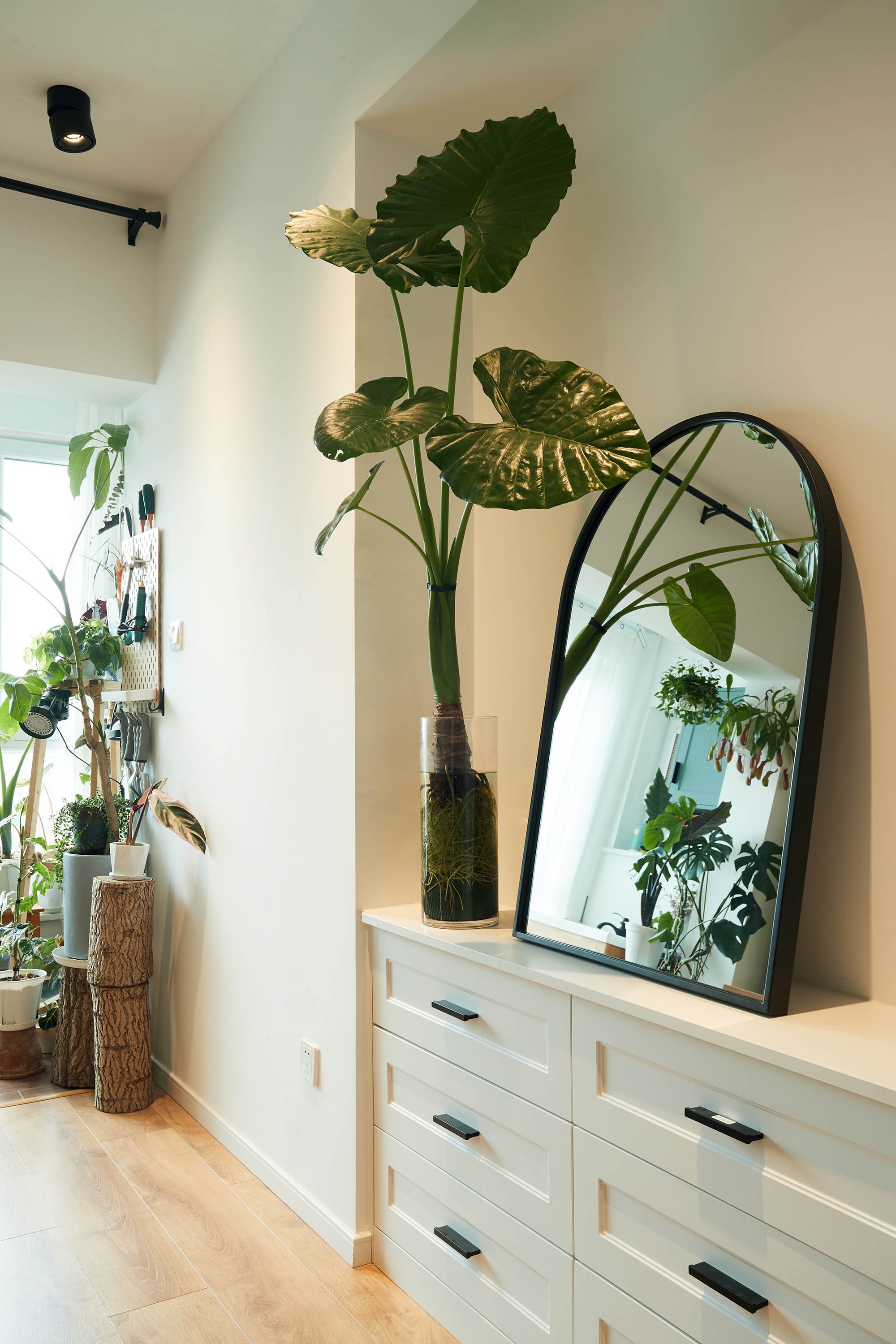 窗戶占據(jù)了臥室的一個轉(zhuǎn)角,視野也隨著窗戶的延伸而開闊舒朗。坐在床邊,窗前是觸手可及的天光,居于室內(nèi),猶如懸停在天地的懷抱中。米黃色的墻體泛著綿綿的奶油感,與寬大的闊葉綠植一同滋潤著心靈,安撫著美好的夢境。