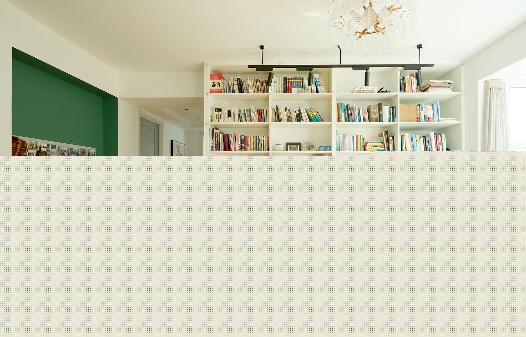 當(dāng)我們熱愛生活的時候,也會熱愛山水、森林、云海、草地??酥朴行虻木G色與層層疊疊的書籍,描摹出起居室無法形容的美,每個生活化的場景都流露出隨性與快樂,每個步伐、或坐或躺,都充滿了情調(diào)與故事。