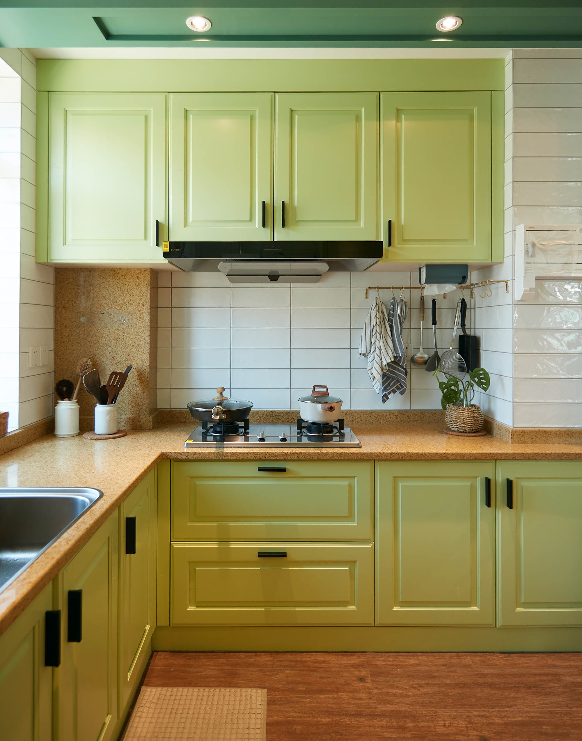 櫥柜用清新的淺草綠色,將廚房的邊緣無限擴(kuò)張,仿佛與室外的美景融為一體。用現(xiàn)代設(shè)計手法找到不同材質(zhì)、不同色調(diào)、不同肌理的美的契合點,提取要素,重構(gòu)、組合、演繹出獨一無二的場域感。