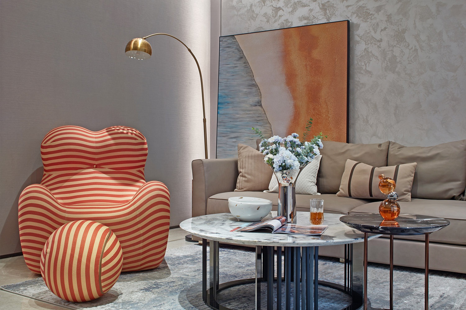 客廳的天花板至背景墻,整體一氣呵成,沒有邊界感,讓生活更加的自在。圓弧的造型搭配側邊的墻布,輕柔觸感,讓空間增加軟的感覺。光線搭配十分柔和,背出光的燈帶,有延伸的層次感,在感官上非常的舒適;自然光透過薄紗窗簾,空間透亮而清澈,仿若置身于被陽光直射的水中。