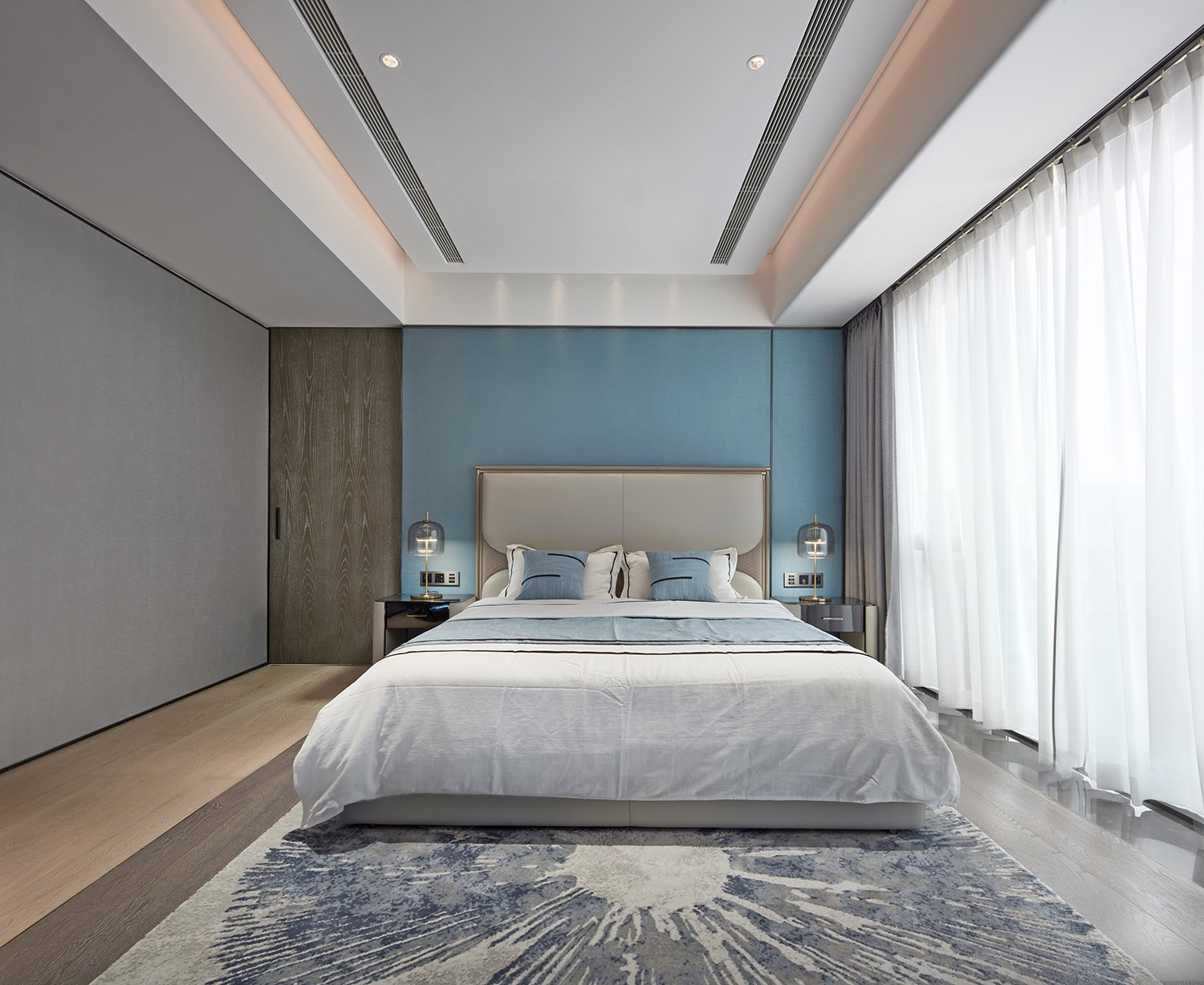 這世間,唯有美食與愛不可辜負??筒蛷d天花采用多層次的燈光,主燈采用BAXTER 的吊燈,搭配輕奢質感的墻布,這樣就是一個舒適愉悅的就餐空間了。人與人之間只要有一個焦點,就能讓我們匯集在一起,去探討美好的人生。質感的島臺和藍色的靠背,就好像海面的小島一樣,在這里喝酒暢聊,有一種自由暢然之感。