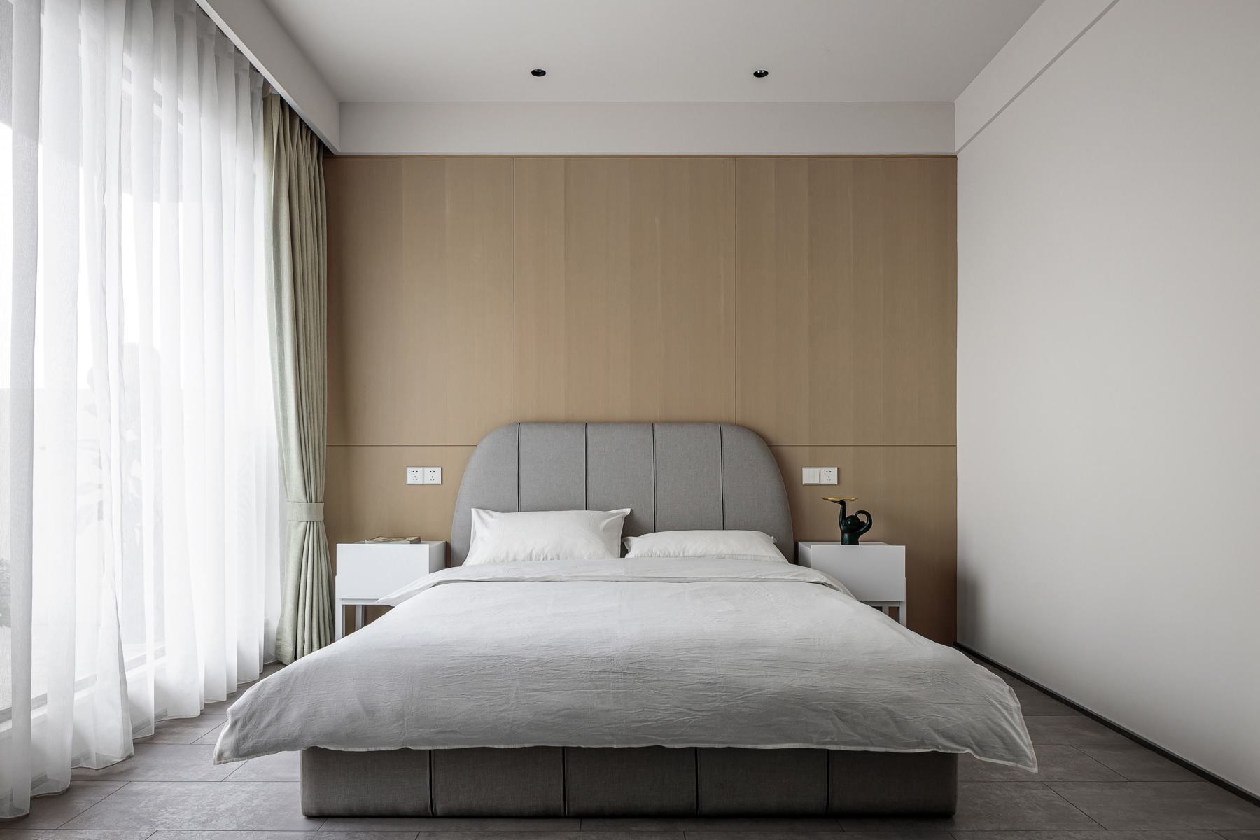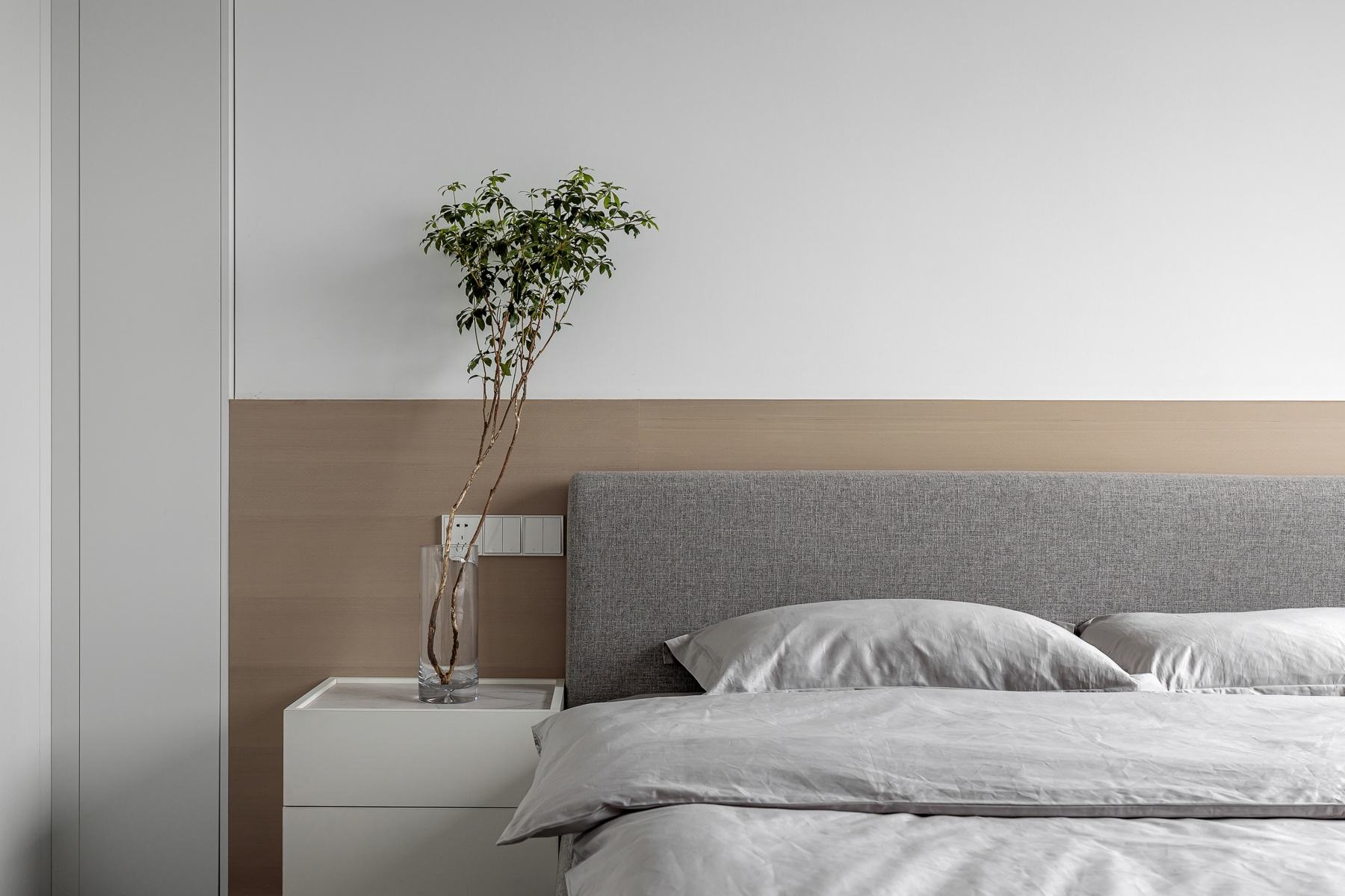 主臥沿用了客廳的色彩,床頭的木紋具有清晰的質(zhì)感,搭配上純凈的白色,簡潔溫潤且富有高級感,空間透露出輕松舒適和愜意的氣息。