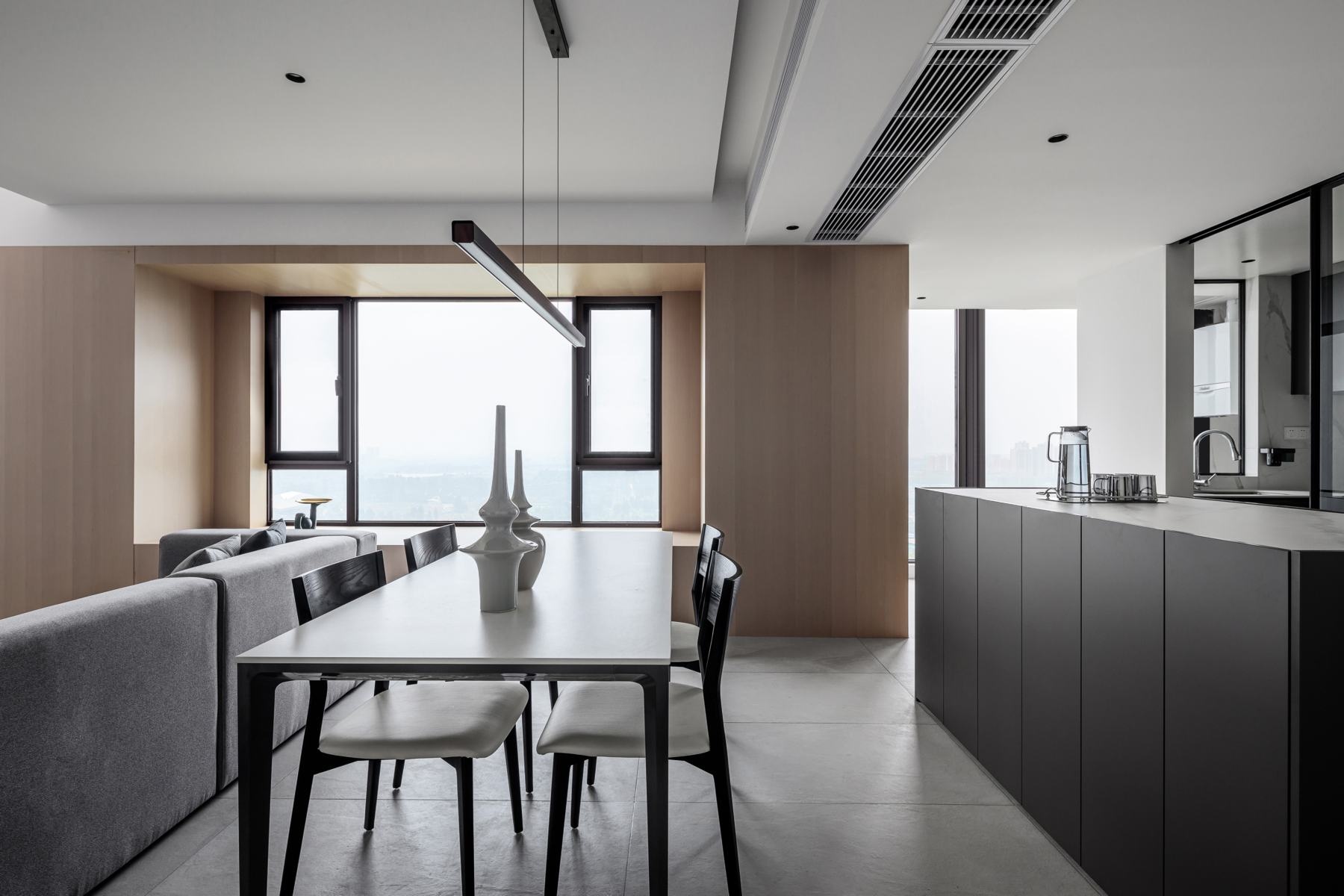 餐廳看向書房,書房采用開放式設(shè)計,極窄邊框的玻璃推拉門增加空間之間的通透性。