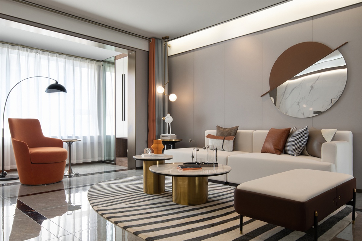 明快的橙色調(diào),自由弧度的線條感,賦予客廳熱情與好客的無(wú)形張力。