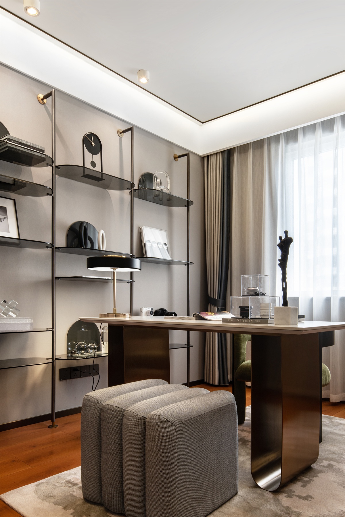 充滿格調(diào)的書(shū)房,靜謐嚴(yán)謹(jǐn)。墻壁的展臺(tái),如藝術(shù)品般相依而列,優(yōu)雅又迷人。