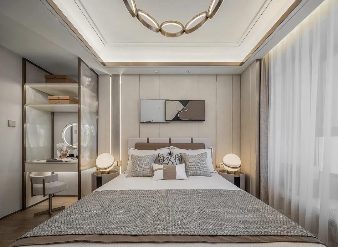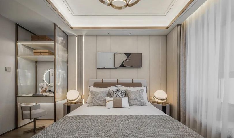 落筆于都市生活的藝術(shù)情致,設(shè)計(jì)運(yùn)用深淺清透的設(shè)色、經(jīng)典雅致的軟飾,令空間浸潤(rùn)著美學(xué)的層次、人文的溫度、現(xiàn)代的簡(jiǎn)雅。經(jīng)典而大方、沉穩(wěn)而低調(diào),是設(shè)計(jì)為次臥空間所構(gòu)筑的風(fēng)格基調(diào)。在輕靈素雅、簡(jiǎn)凈質(zhì)樸的現(xiàn)代風(fēng)格中,設(shè)計(jì)通過伸展的花枝,為空間增添一筆自然的氣韻,將雅致的人文氣息娓娓道來。