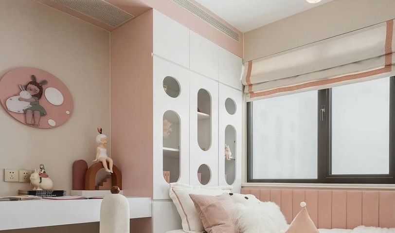 設(shè)計(jì)師賦予此間的是女孩溫柔可愛的性格,圓形幾何語素的地毯和燈具、生動(dòng)活潑的擺件與掛畫,在淺粉與白色的色調(diào)烘托下,氤氳出女孩的浪漫與純真。