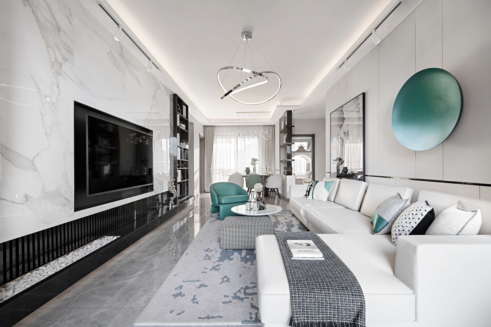 和諧而安靜的環(huán)境給人無限的恬靜,休閑椅的一抹復(fù)古綠投射出藝術(shù)的張力,旁邊的藝術(shù)擺件在表象視覺之下,設(shè)計師極盡克制,賦予了客廳時尚美學(xué)和生活藝術(shù)。