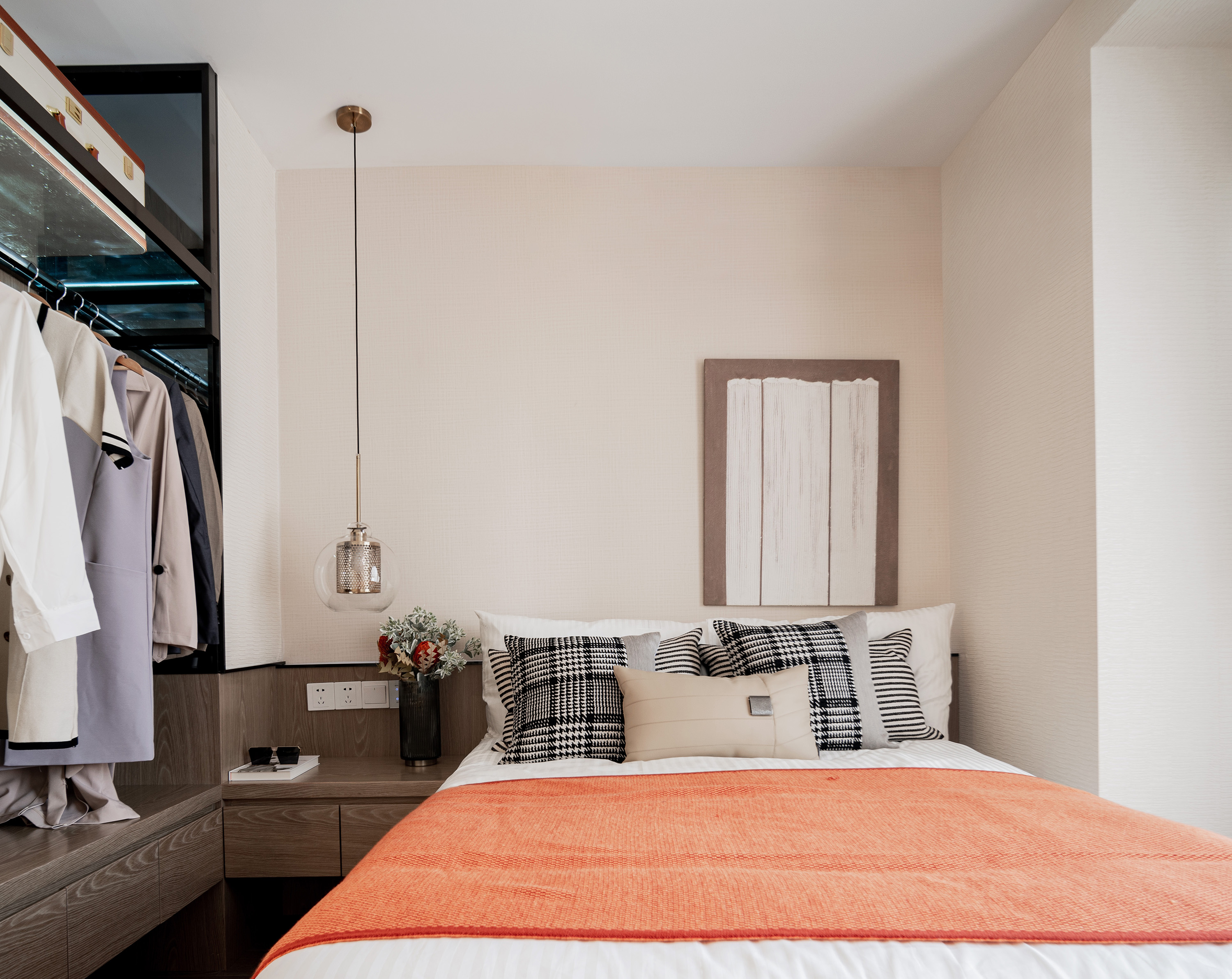 主臥延續(xù)整體空間木與白的結(jié)合,充滿現(xiàn)代簡(jiǎn)約質(zhì)感,光線充足,運(yùn)用沉靜有力的設(shè)計(jì)語(yǔ)言營(yíng)造一個(gè)舒適簡(jiǎn)潔的空間氛圍。