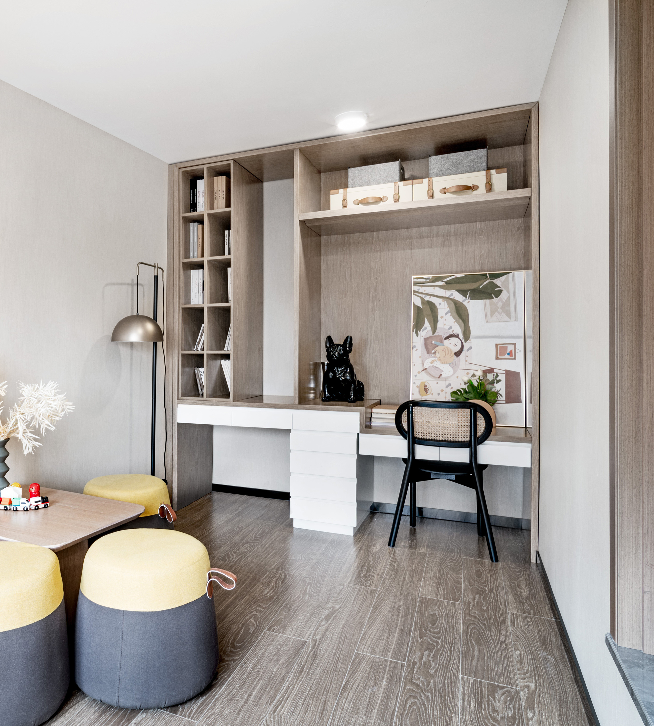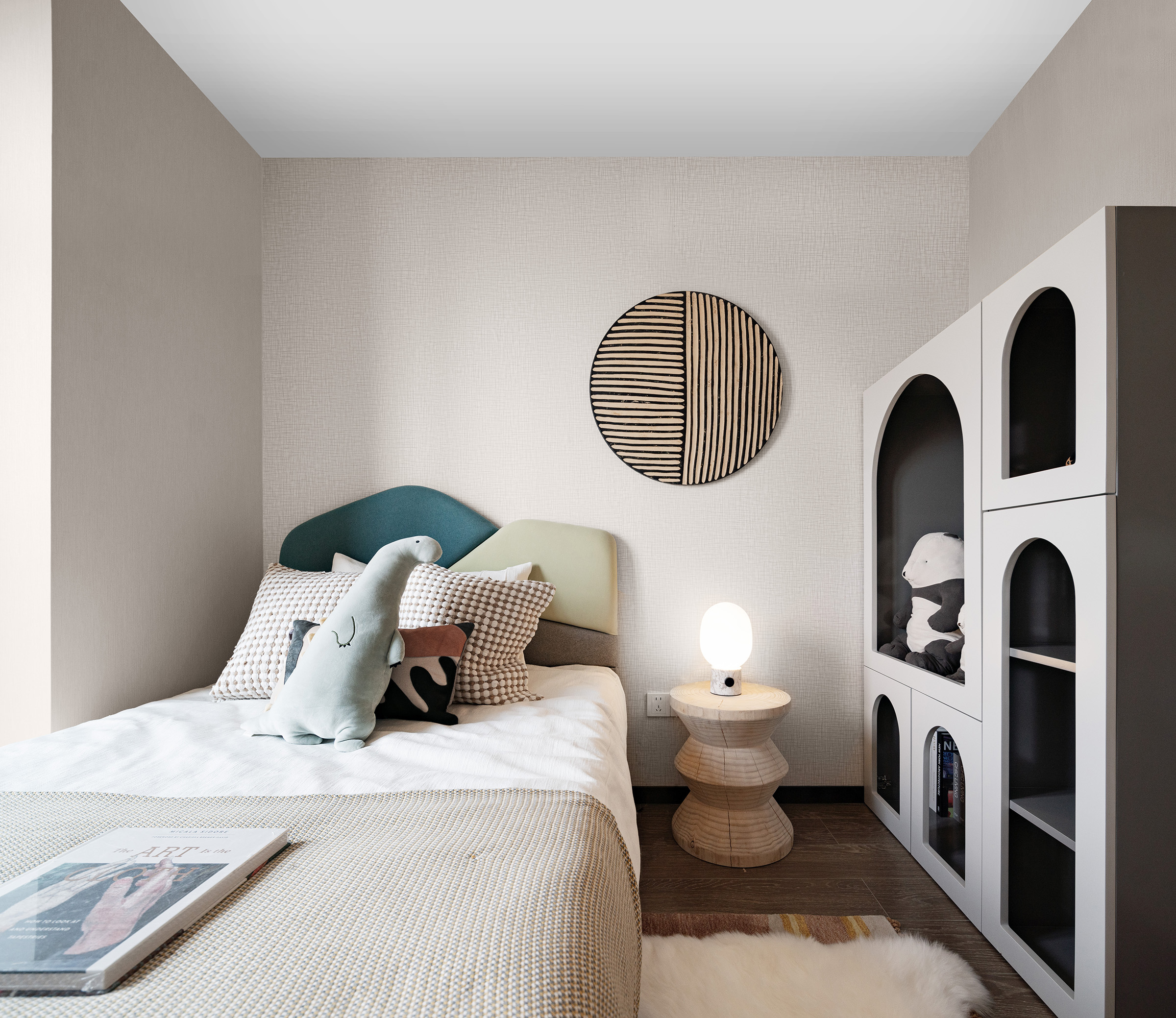 兒童房并不一味的填滿童真符號(hào),淺色系搭配少量拼接色塊,把控童趣的尺度,讓空間具備較長(zhǎng)的成長(zhǎng)范圍。
