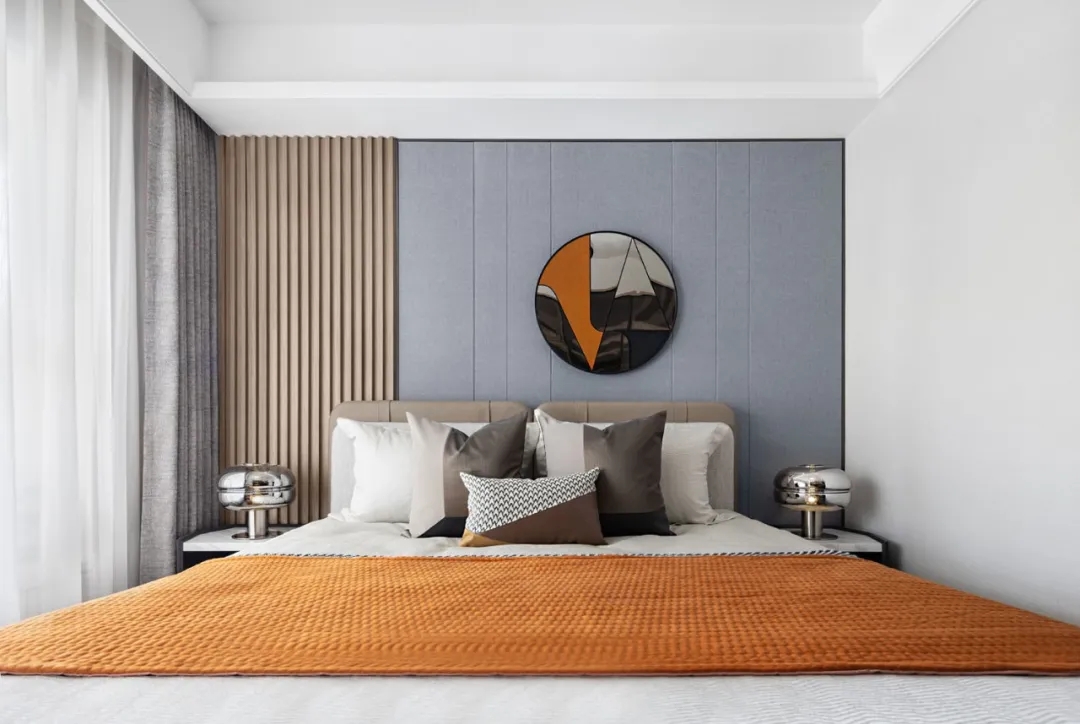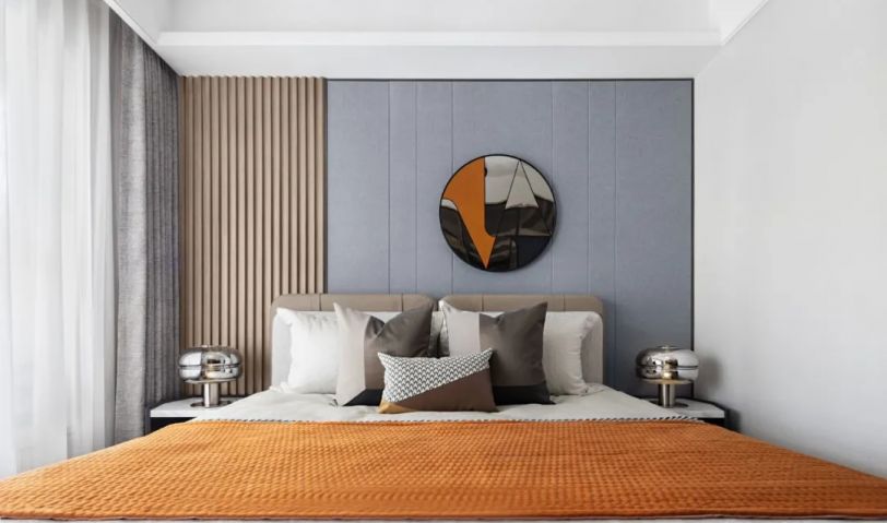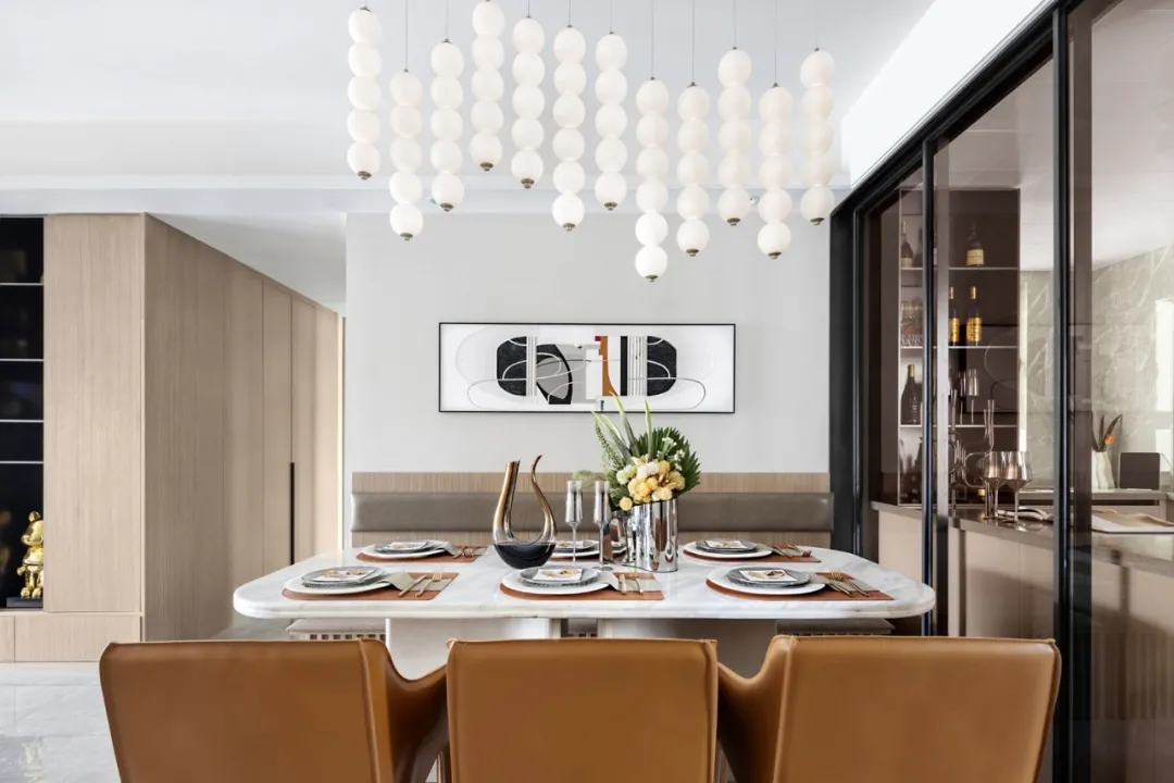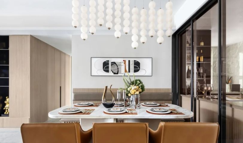開放式布局的客餐廳及陽臺(tái),是形式和精神的交匯融合。通過高級(jí)灰和暖橙的色彩構(gòu)成來渲染氛圍,描摹了城市精英階層向往的休閑生活場(chǎng)景。大理石、金屬、皮革、玻璃,詮釋出空間的精致質(zhì)感。而整體飽和度的降低,透過不同彩度的高級(jí)灰豐富層次,更加強(qiáng)化了舒適怡人的感官體驗(yàn)。