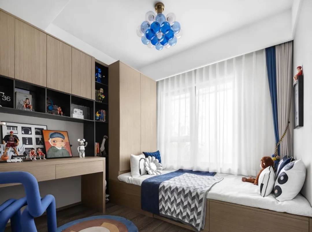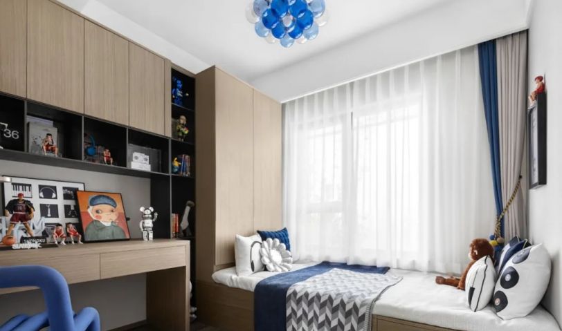 兒童房以明亮的藍(lán)色與暖橙相互碰撞,空間中融入收藏手辦的興趣愛好,放置玩具收納柜,為小主人留有足夠的玩耍收納空間。柜內(nèi)各式玩具與書籍,前方櫻木花道公仔迎光而立,好似一個(gè)奮發(fā)向上的少年,身后承載著的是夢(mèng)想,而夢(mèng)想在閃閃發(fā)光。