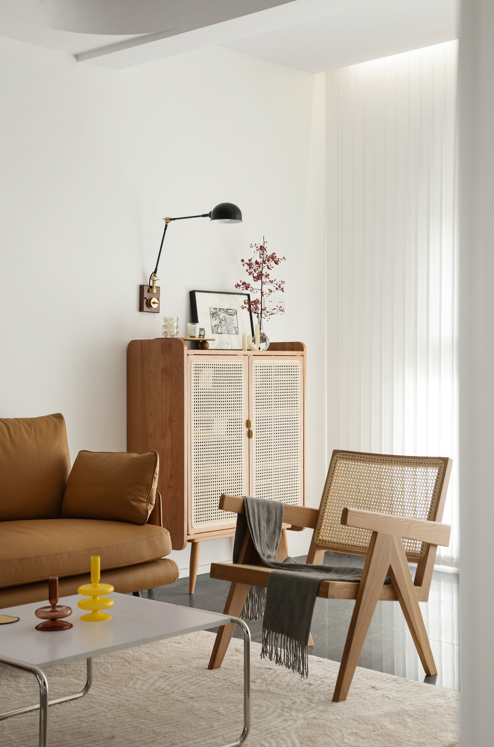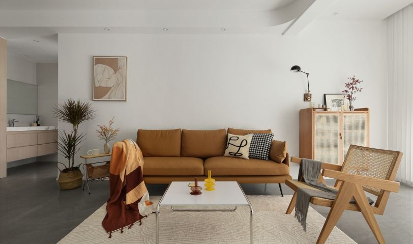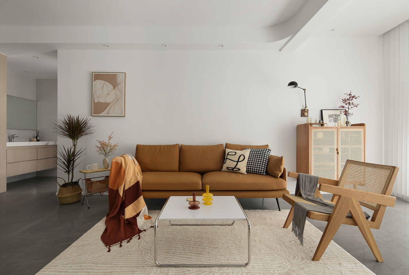 女主小姐姐喜歡溫和的顏色,我們在設(shè)計交流的時候,把色調(diào)定為木色白色為主,暖橙點綴,灰色打底,整體空間給人靜謐溫馨的感覺。燈光設(shè)計采用無主燈,用點光源壁燈等組合滿足客廳采光需要,頂部的弧形增強設(shè)計感,也令空間更柔和。沙發(fā)背景干凈簡約,木橙散發(fā)緩緩暖意。
