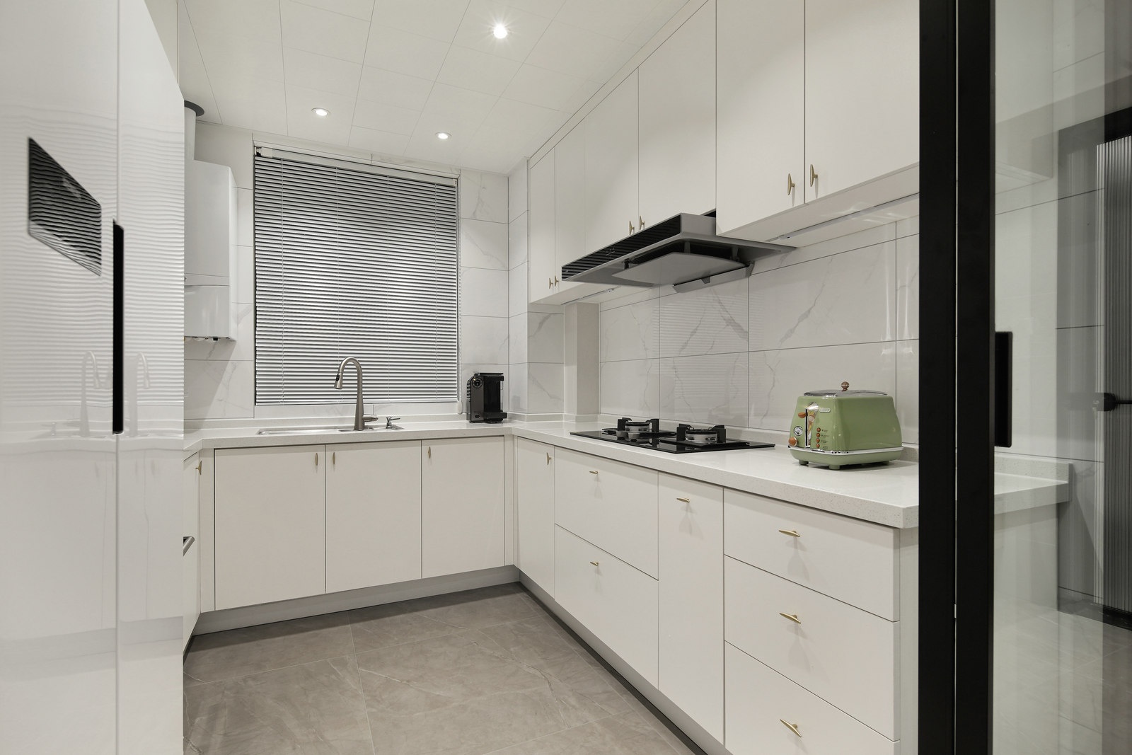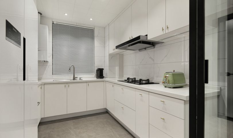 廚房U型櫥柜,乳白色干凈明亮,搭配精致的柜門小把手,細節(jié)見品質(zhì)。