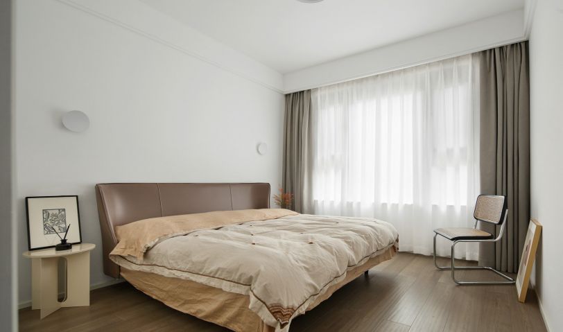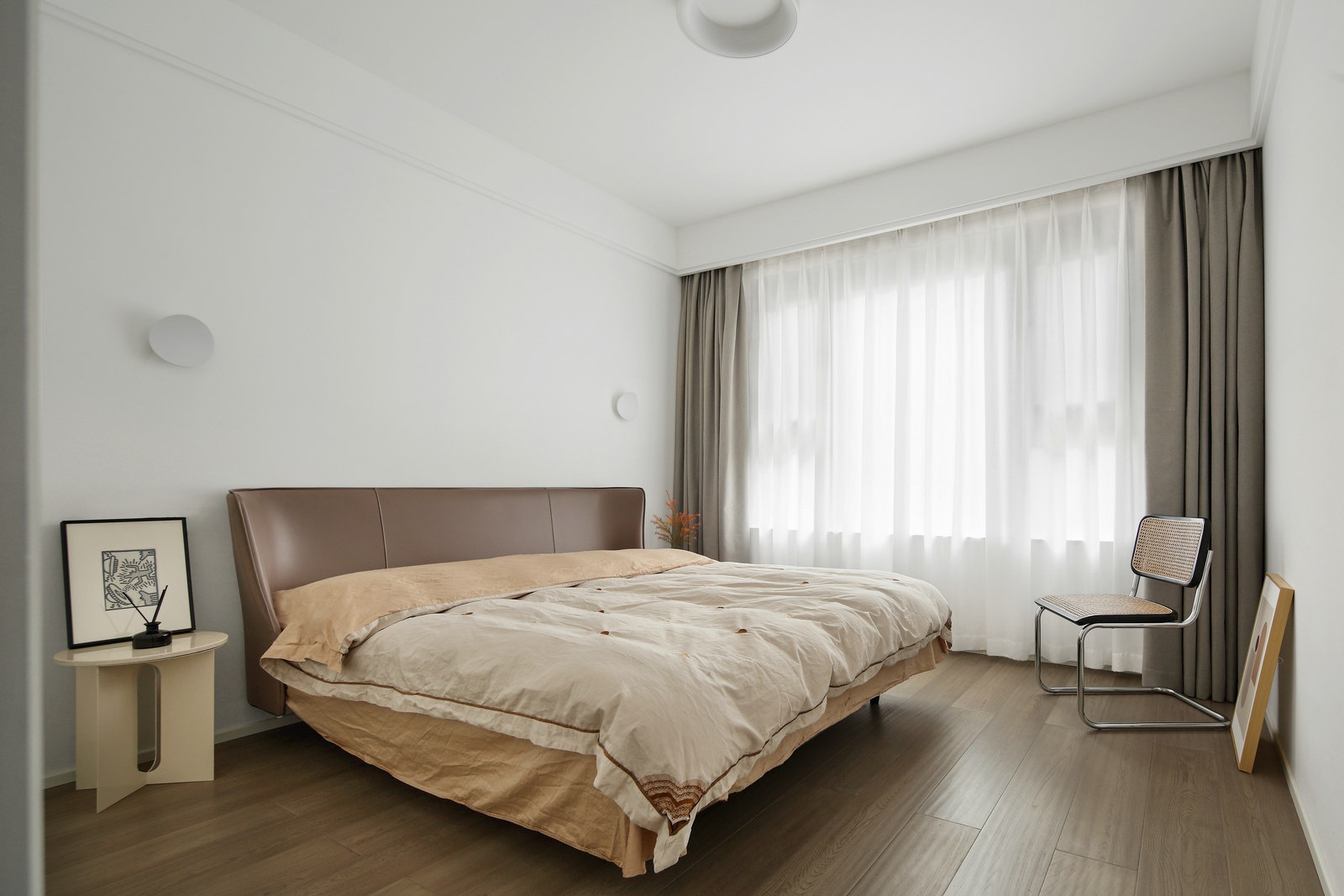 主臥的衛(wèi)生間外放后,這里變身一個純粹的休息空間,一對簡約壁燈,皮質(zhì)床頭,臥室的材質(zhì)和色彩的選擇都延續(xù)客廳的基調(diào),整體美感由此而生。