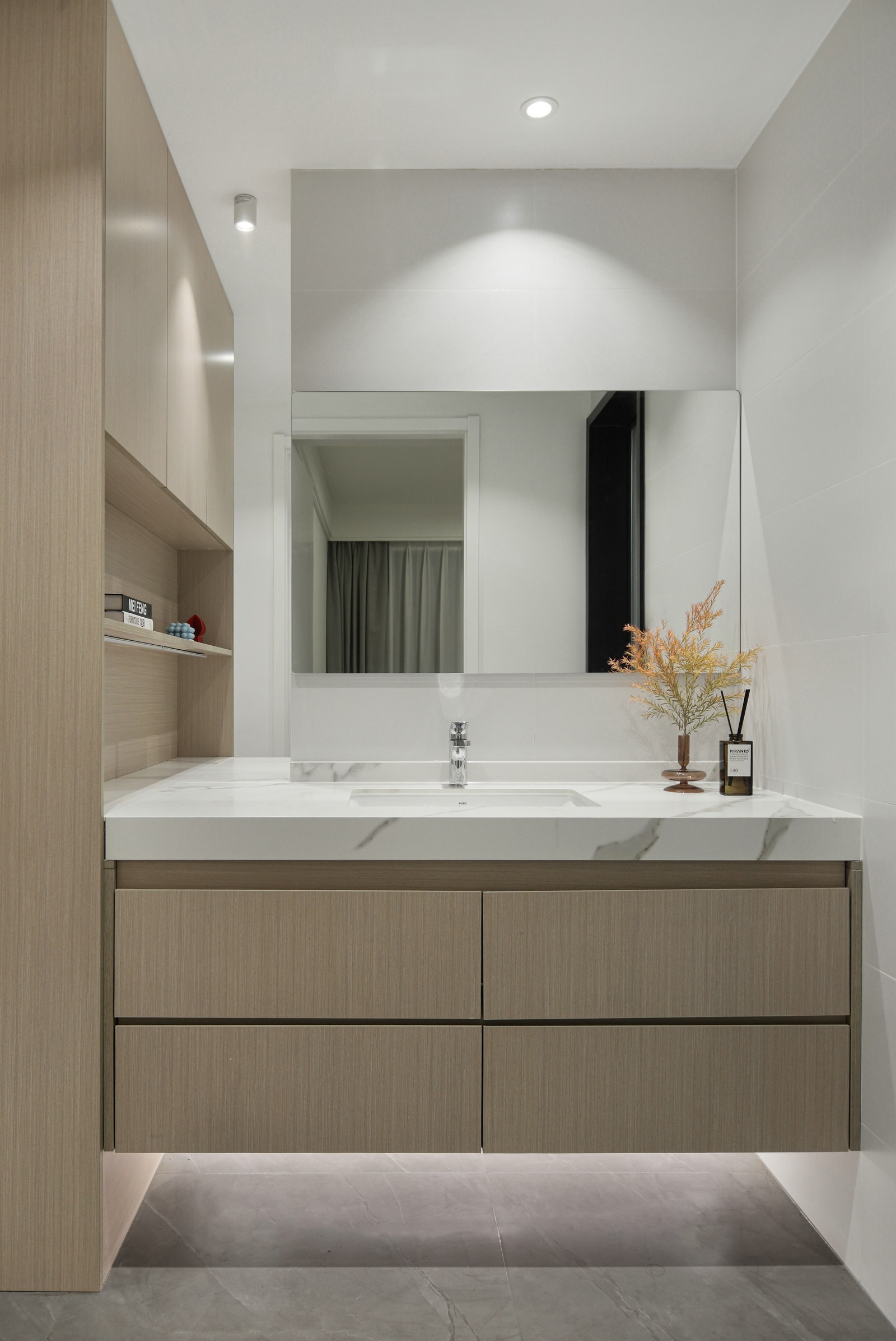 干區(qū)延續(xù)懸掛柜設(shè)計,方方面面考慮到實用和美觀。大理石臺面和木飾面形成材質(zhì)對比,一剛一柔間提升氣質(zhì)。
