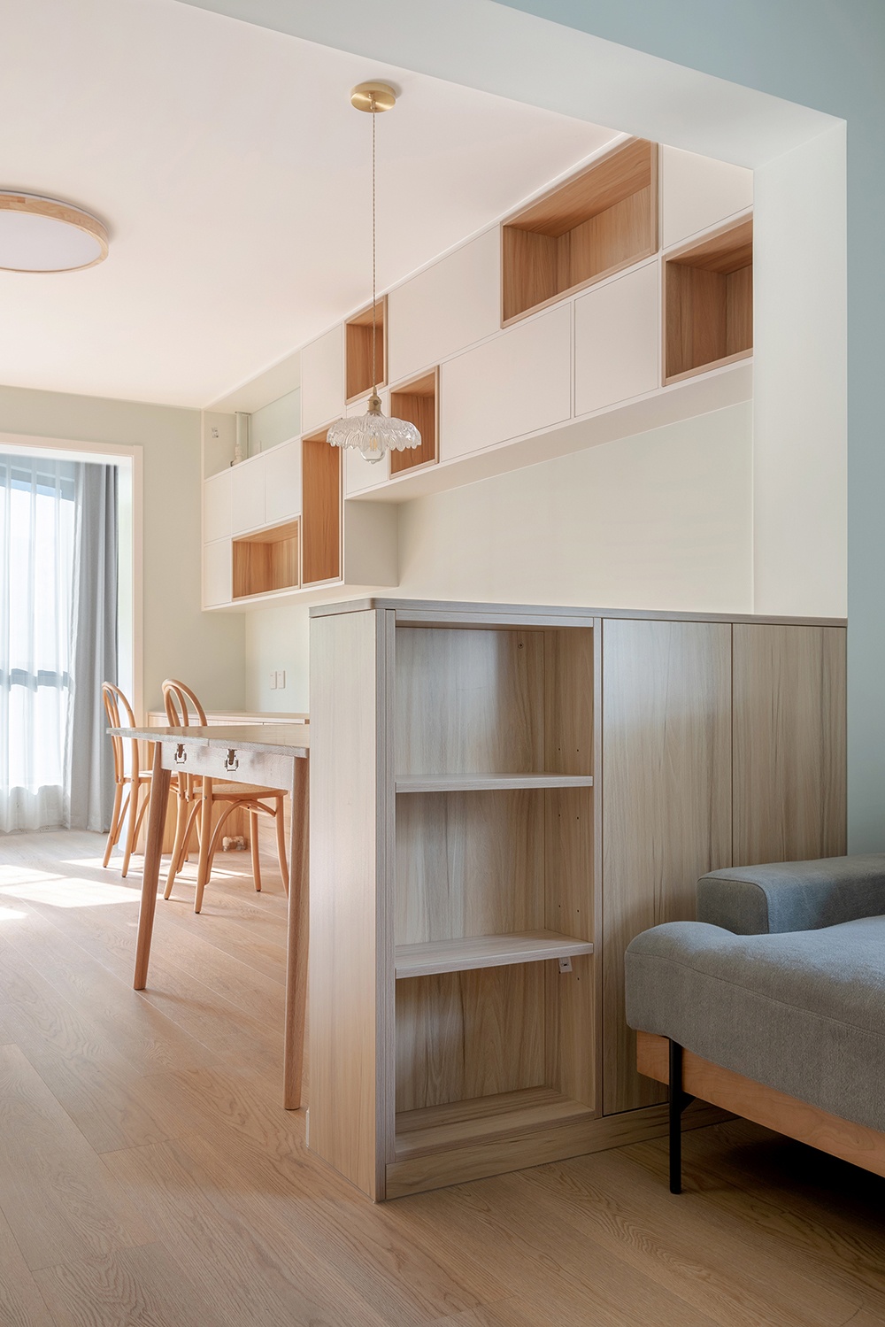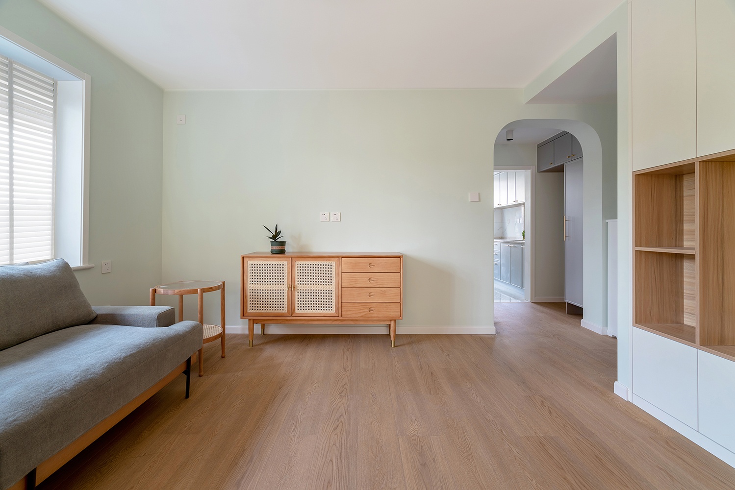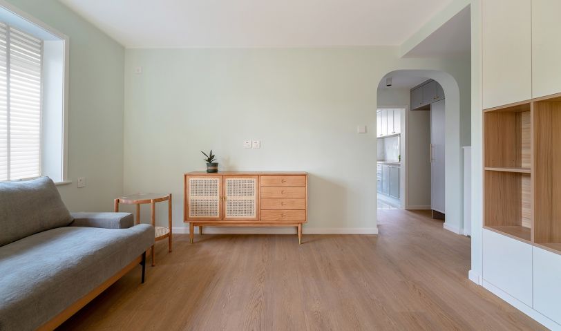 客廳沒有過多的裝飾,木地板搭配墻面的馬卡龍色,清新自然。沙發(fā)旁邊的柜體里邊是暖氣分水閥,留了敞開的格子供沙發(fā)這邊使用。淺灰色的沙發(fā)不僅有顏值,坐感也很舒適。柜體細節(jié)圖,原木色的板材和淺灰色布藝的沙發(fā)兩種材質的綜合。配比恰如其分,毫無違和感??蛷d區(qū)域有一個朝西的窗戶,下午西曬比較嚴重,配了不占空間且能過濾陽光的百葉簾。白色的百葉簾與埡口顏色統(tǒng)一,門洞圓弧的處理,讓整個空間變得更加溫和、流暢。電視柜結合儲物空間來做,全白色未免有些單調乏味,加入原木色套格,豐富立面效果的同時,避免視覺疲勞。