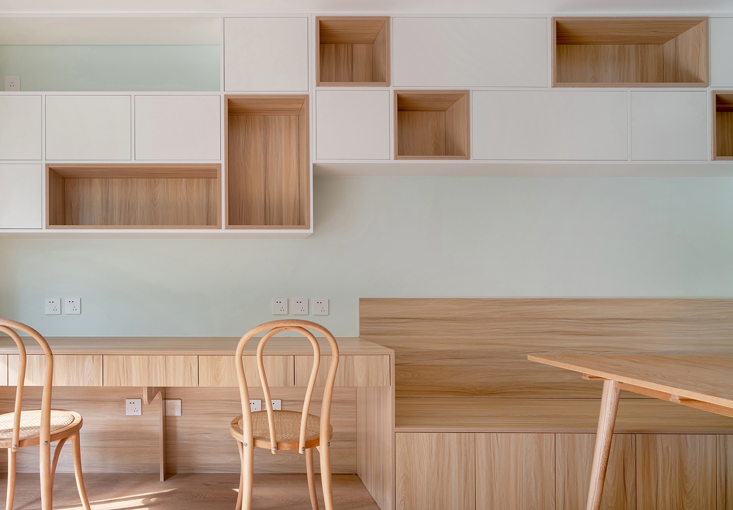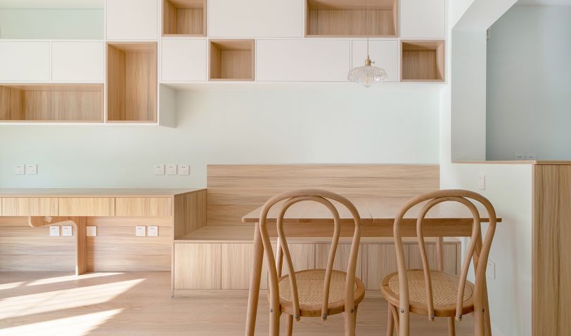 餐廳一側選擇了卡座的形式,下邊結合儲物來做。餐桌選擇了可以抽拉的餐桌,平時1200mm,親戚朋友來了,多人就餐可以切換成1400mm。