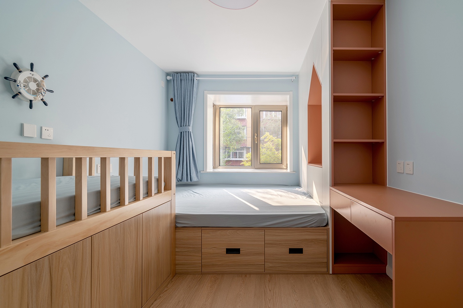 朝南的兒童房,定制了超大的榻榻米睡眠區(qū),旁邊加了獨立的單人床,輕松的容納下一家四口的睡眠空間。墻面的輪舵造型壁燈充滿了童趣,窗簾選擇了跟墻面一個色系的藍色。兒童房書桌還有敞開格做了橙色,飽和度相對高一些,跟墻面做一個強烈的對比,激活空間。因為是兒童房,兩個孩子都還小,舍棄一部分儲物空間,做了小房子造型的龕,盡量的增加一些童趣的元素進去。
