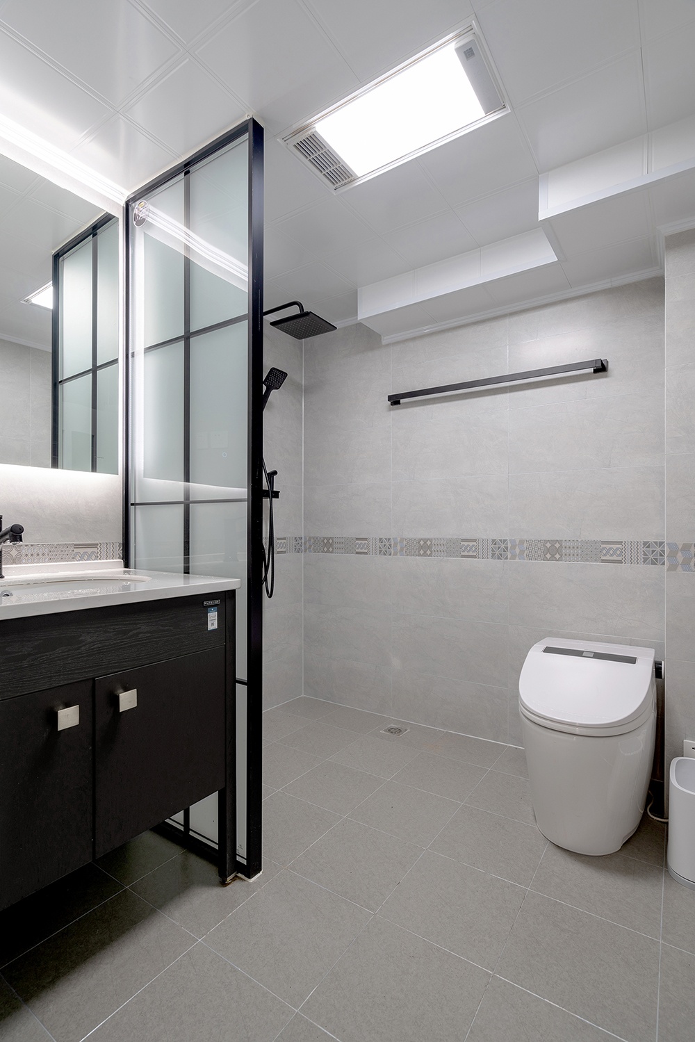淋浴區(qū)預留了足夠的空間,供媽媽給兩個孩子洗澡的操作空間?;⒉AЦ魯嗪兔砑芏冀y(tǒng)一用色。