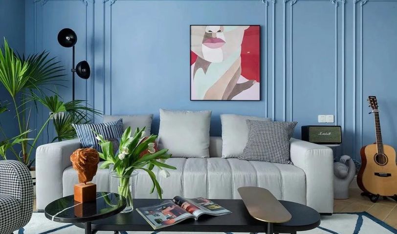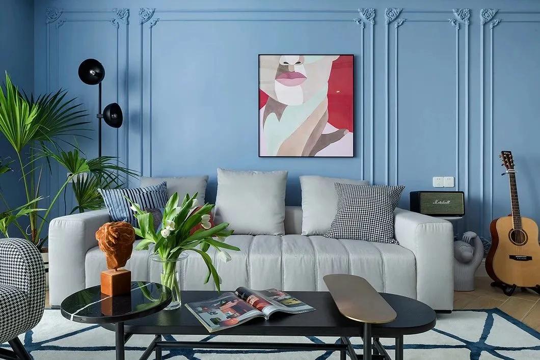 客廳整體現(xiàn)代舒適的空間,陽臺與客廳打通做成抬高的地臺,裝上紗簾讓自然采光進(jìn)入客廳,而客廳整體在藍(lán)色的墻面基礎(chǔ),布置深色電視柜與茶幾,在綠植與優(yōu)雅家具的搭配下,也讓空間顯得格外的安靜高檔而優(yōu)雅。沙發(fā)墻在藍(lán)色的背景墻基礎(chǔ),加入邊框造型,并掛一幅紅色的裝飾畫,增添了空間的時尚氣質(zhì)?;疑妓嚿嘲l(fā)+黑色橢圓茶幾組合,沙發(fā)邊上的盆栽與吉他,也使得空間更加有精致感。
