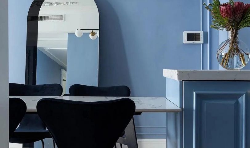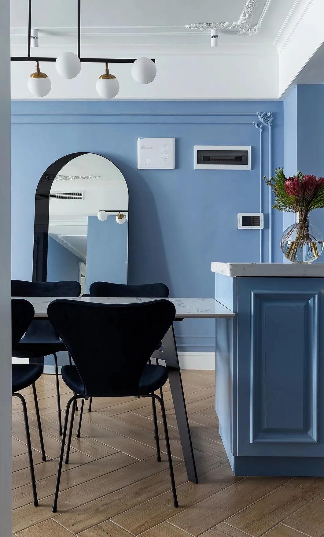 餐廳保持藍(lán)色調(diào)的空間,在靠近門口的過道靠放一面拱形造型的全身鏡,為主人出門提供了一個整理儀容的體驗;餐桌則是挨著中島臺布置,以石材臺面的設(shè)計,搭配上深色的餐椅,臺面上還有花瓶的布置裝飾,也讓空間顯得更加優(yōu)雅浪漫而情趣。