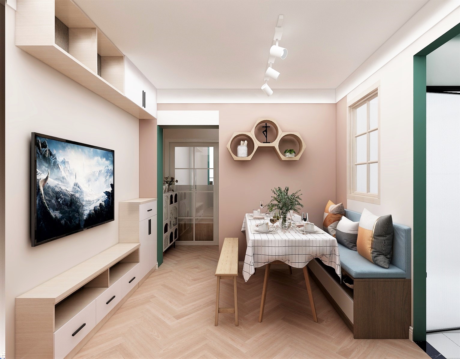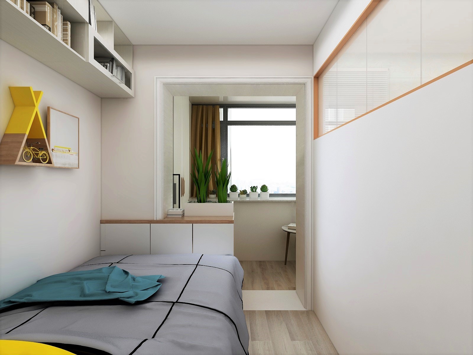 這是一個(gè)小一居室,客戶為將來(lái)孩子上學(xué)準(zhǔn)備的,需要給孩子一個(gè)獨(dú)立切有陽(yáng)光的臥室。還需要單獨(dú)的客餐廳區(qū)域。根據(jù)客戶需求合理的給他規(guī)劃了室內(nèi)空間