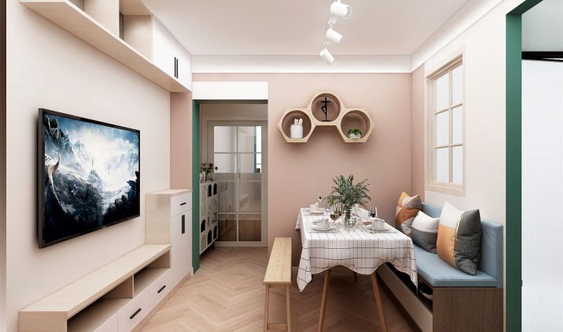 客餐廳使用沙發(fā)卡座和多功能餐桌實(shí)現(xiàn)客餐廳一體的功能