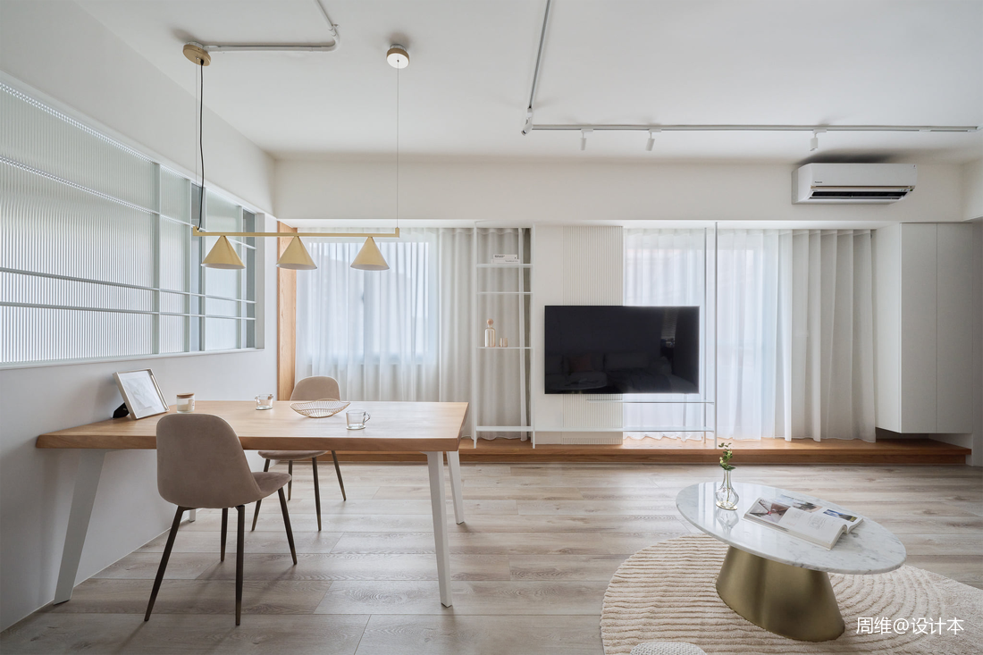 本案通過奶油色系給予空間理性溫柔感性的基調,復古的線條搭配上舒適的軟裝,開闊的空間為整個設計帶來自由閑適的感覺,以虛與實間的電視背墻打破傳統(tǒng)設計框架,在線與線間的沙發(fā)背墻隱藏廚房臥室,劃過空間的每道線型分割都有其存在意義,家的每個角落,一點一滴,從空有的想像澆鑄成了每天的景象。