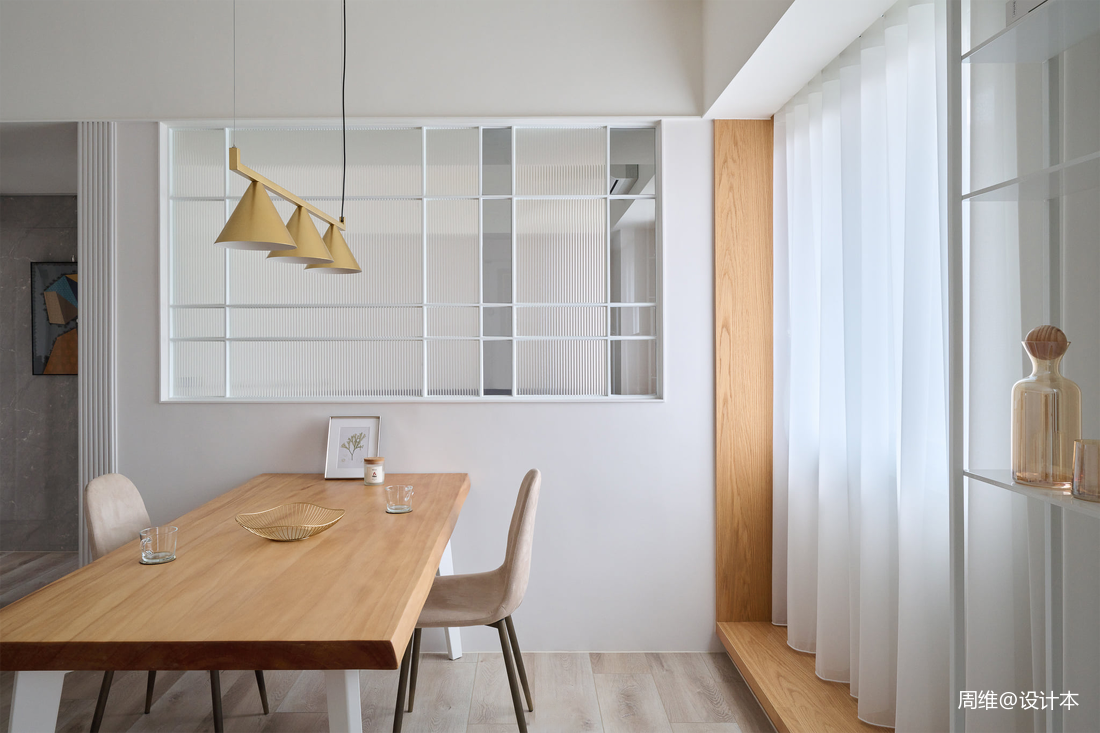 在餐廳這面墻,增加長虹玻璃營造精致感黃銅質感的吊燈,就餐區(qū)搭配原木色的餐桌,復古又溫馨,