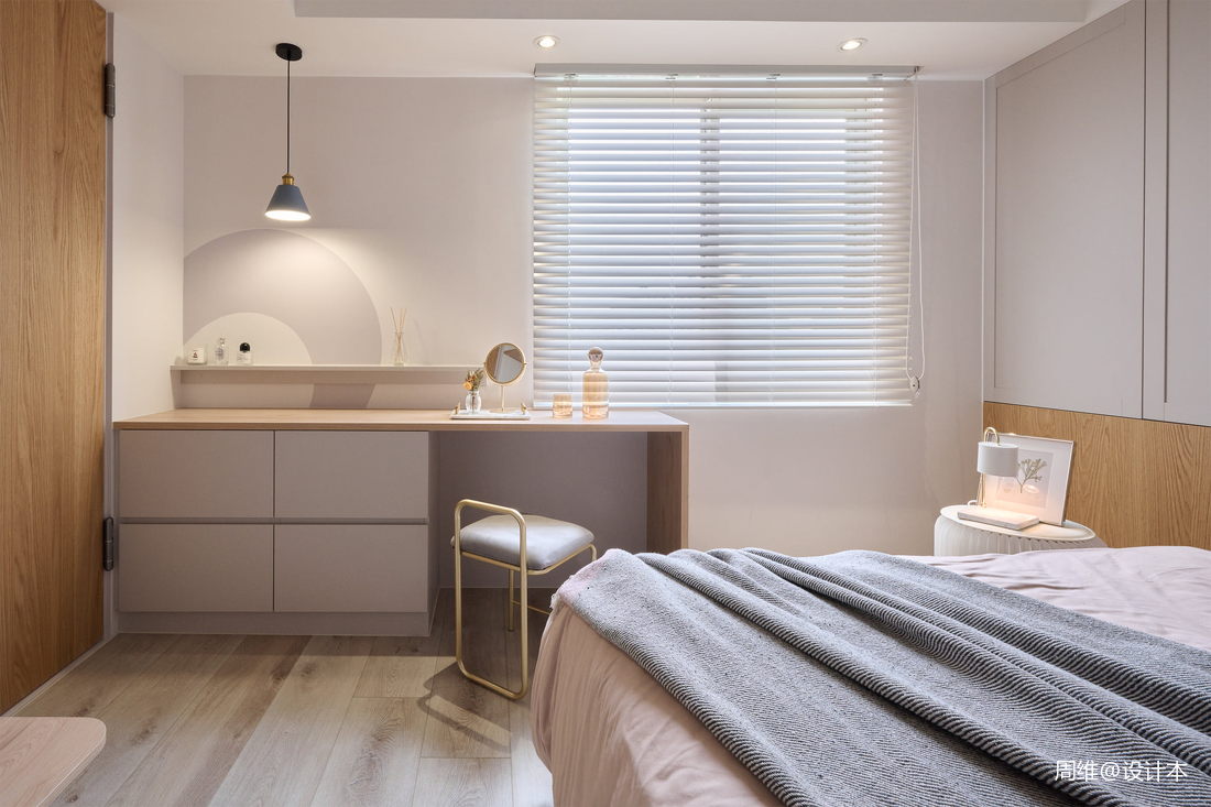 臥室的設計延續(xù)公共區(qū)域的設計語言,奶油色營造放松、溫馨的氛圍,搭配原木質感的護墻板,低調又不失柔美,再配以原木的化妝桌,溫馨優(yōu)雅,把生活的品質展現的恰到好處。