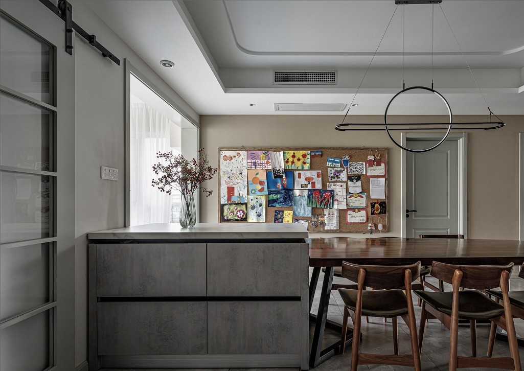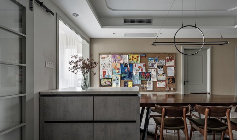 餐區(qū)是平日家人距離最近的地方,大家一起聊聊學(xué)習(xí)、工作、和開心的趣事。樂享其中。用軟木做的背景,孩子創(chuàng)作的作品成為主角。