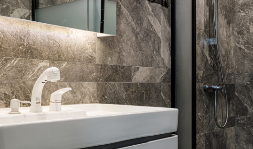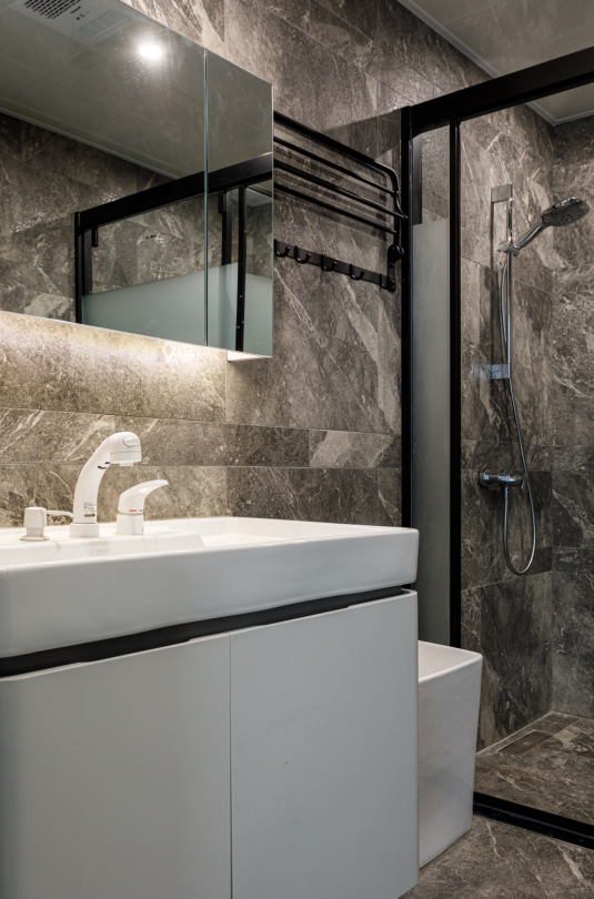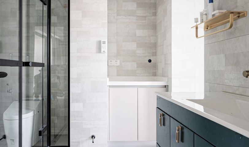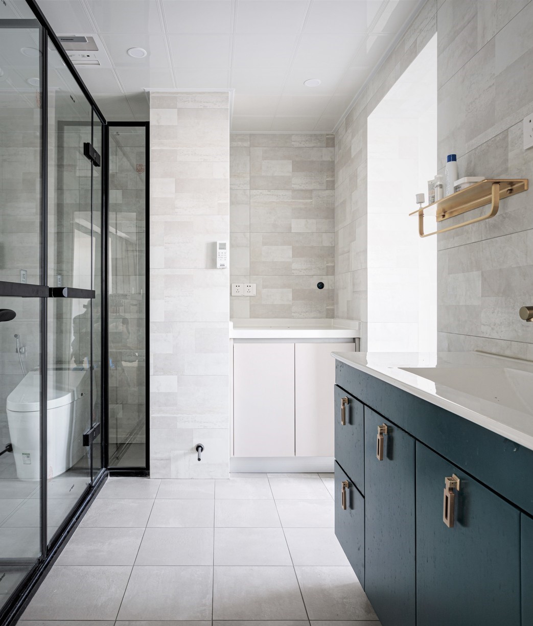 分離式設(shè)計需要的是空間。能滿足的盡量是滿足,使用起來確實方便,對于一層客衛(wèi),整體搭配上以深色磚來凸顯氛圍品質(zhì)感,瓷磚的大小構(gòu)成比例的變化,讓單一色調(diào)的瓷磚更加有層次感。