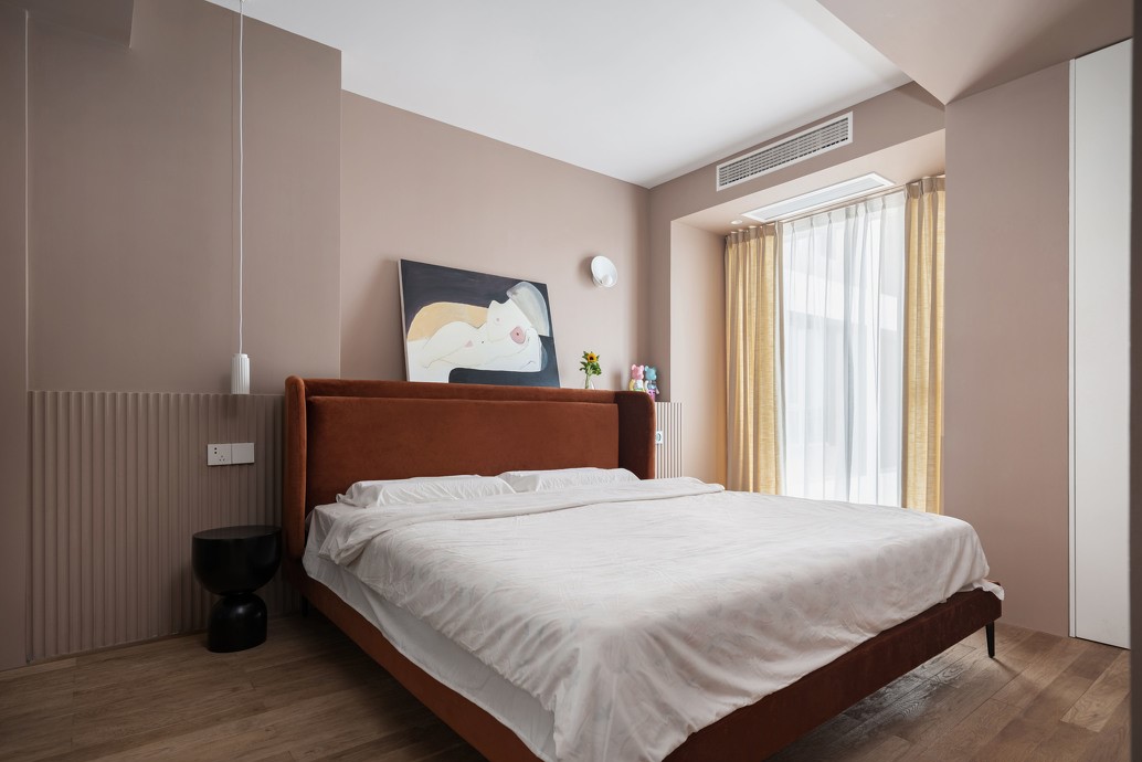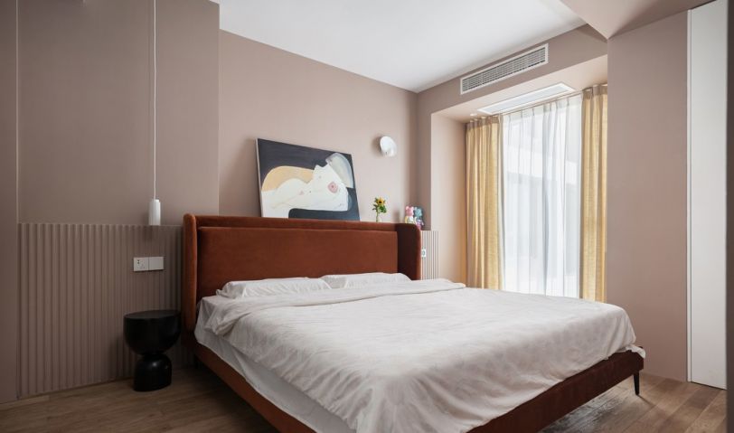 主臥的床頭后面是一個(gè)廚房凸出來(lái)的煙道,我們利用這個(gè)區(qū)域做了一個(gè)臺(tái)面,用來(lái)放置一些裝飾畫(huà)以及手辦,使臥室更加精致。創(chuàng)意沙漏造型的圓幾作為床頭柜使用,不管是裝飾還是實(shí)用性都是極強(qiáng)的