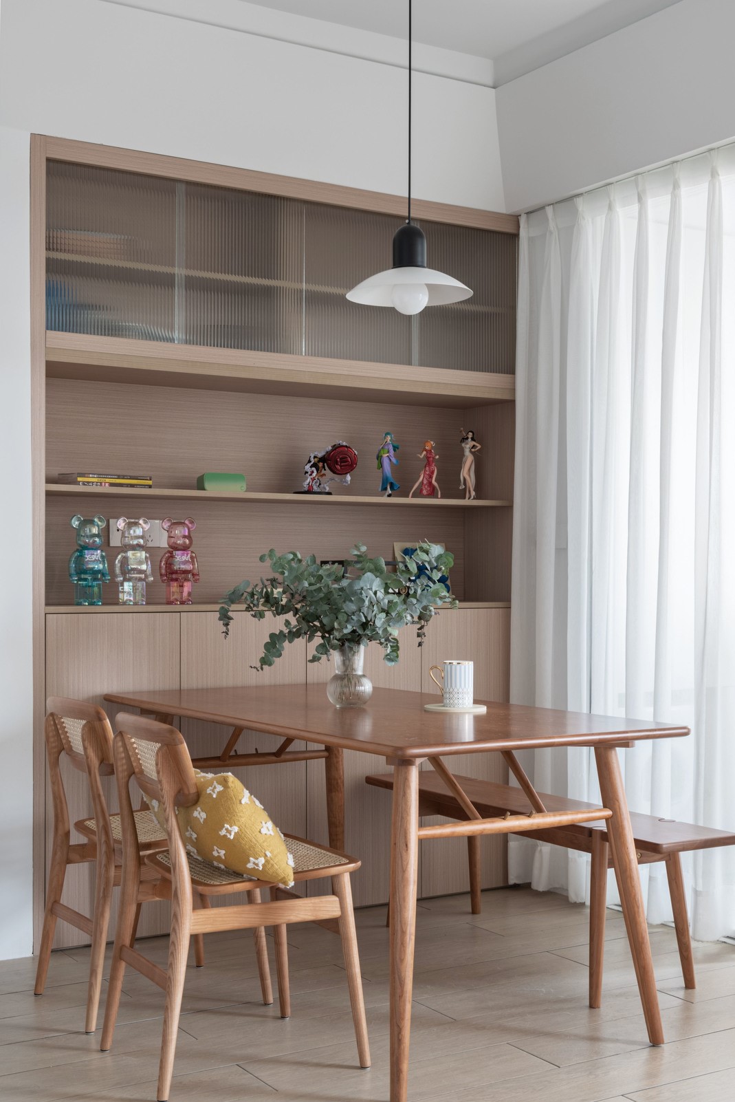 餐廳的瓷磚在選擇上跟客廳形成了統(tǒng)一,避免出現(xiàn)視覺(jué)雜亂。家里的儲(chǔ)物柜都是采用定制烤漆顏色和實(shí)木貼皮,為了讓柜子的外觀更接近原木。