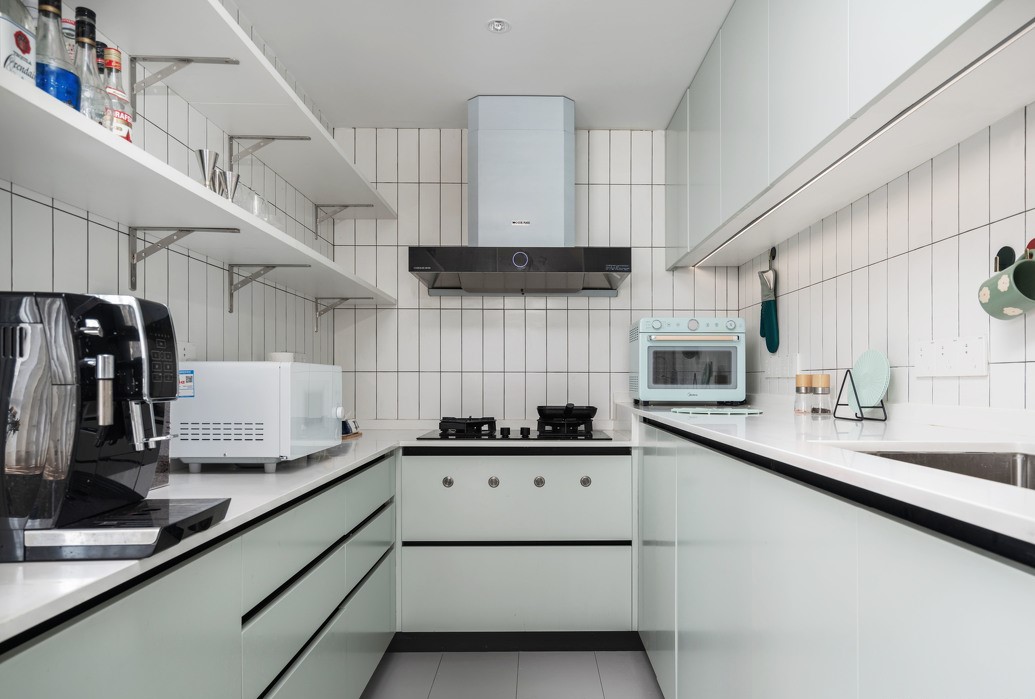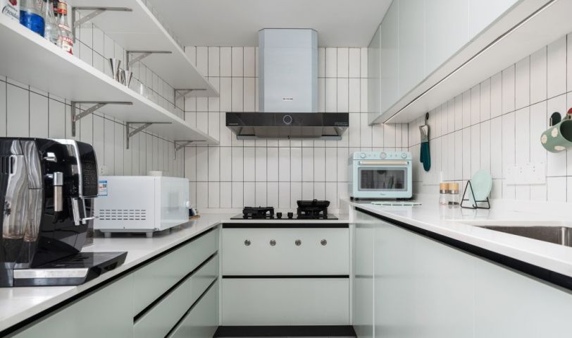 我們將廚房與衛(wèi)生間的所有隔墻拆除,重新規(guī)劃后,衛(wèi)生間位置向里挪動(dòng)從而擴(kuò)大使用面積,將冰箱放置廚房外面,讓廚房的儲(chǔ)物空間得到了提升。右邊上方全部做成了儲(chǔ)物柜,左邊則做了兩排置物架,燃?xì)庠钕路绞浅閷鲜降膬?chǔ)物柜,方便平時(shí)的拿取。U形的操作臺(tái)面容納兩個(gè)人綽綽有余。偶爾周末兩個(gè)人體驗(yàn)下廚的樂(lè)趣,也是一種幸福的生活狀態(tài)。