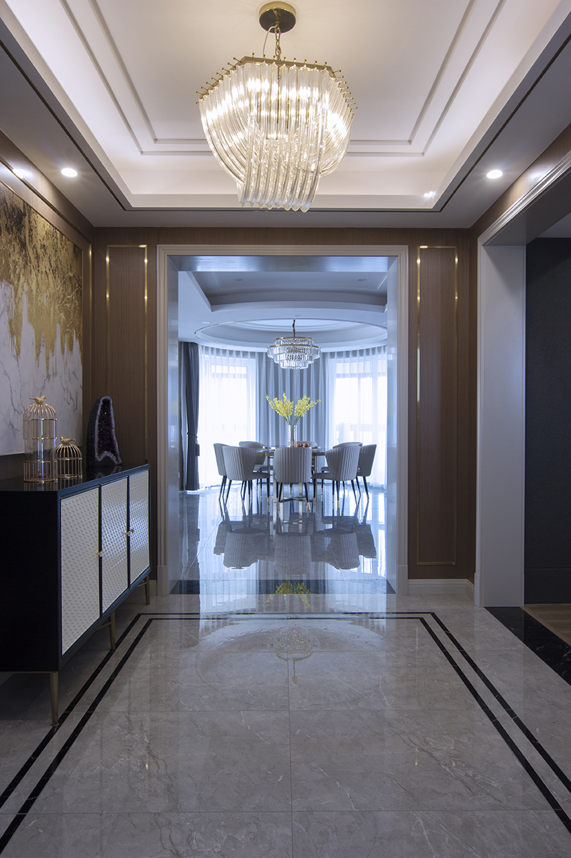 玄關(guān)處因?yàn)槭歉鱾€(gè)空間流線的中轉(zhuǎn)站,所以玄關(guān)柜設(shè)置在了一側(cè)。頂面吊頂造型和地面黑色走邊呼應(yīng),中間配了一個(gè)適中的水晶燈。