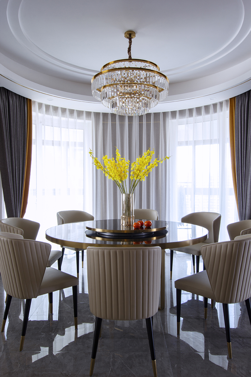餐廳因?yàn)榭紤]到要放圓桌,所以對(duì)應(yīng)設(shè)計(jì)了圓頂造型。頂面內(nèi)嵌式的不銹鋼線條,讓簡單的吊頂更顯質(zhì)感。