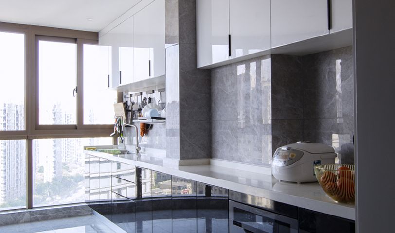 廚房用了黑白色的搭配,下深上淺。大面積的落地窗,讓整個(gè)廚房更通透明亮。