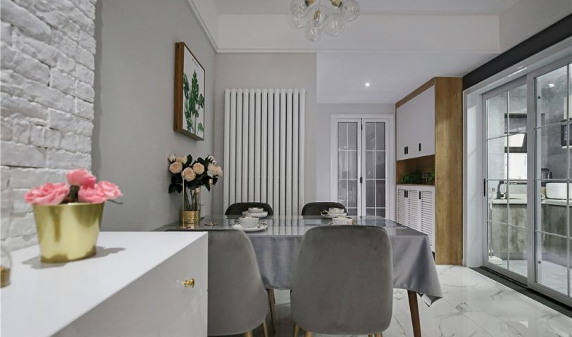 由于餐廳空間略顯狹小,暖氣片便成了墻面獨(dú)特的裝飾,金屬、絲絨等帶著輕奢符號的元素妝點餐廳,營造一種低調(diào)卻又有品質(zhì)的生活氣息。