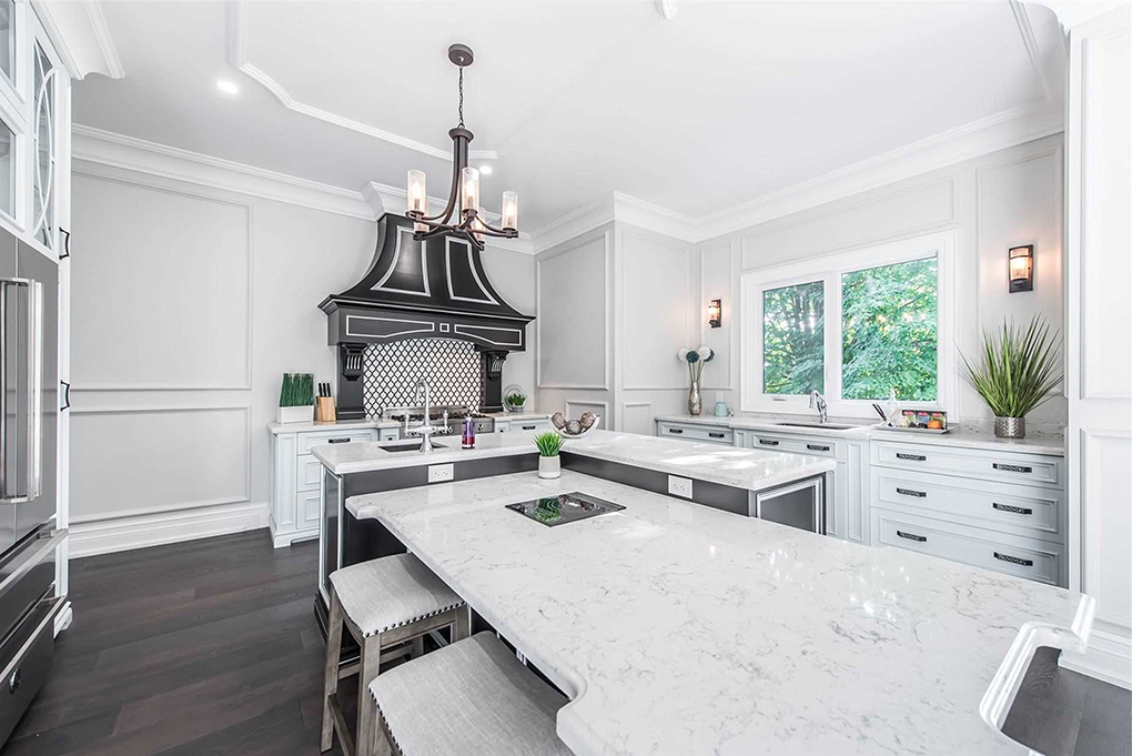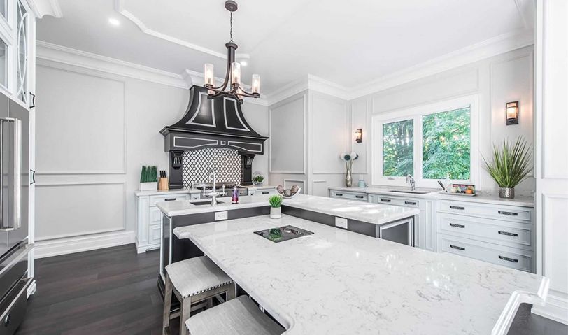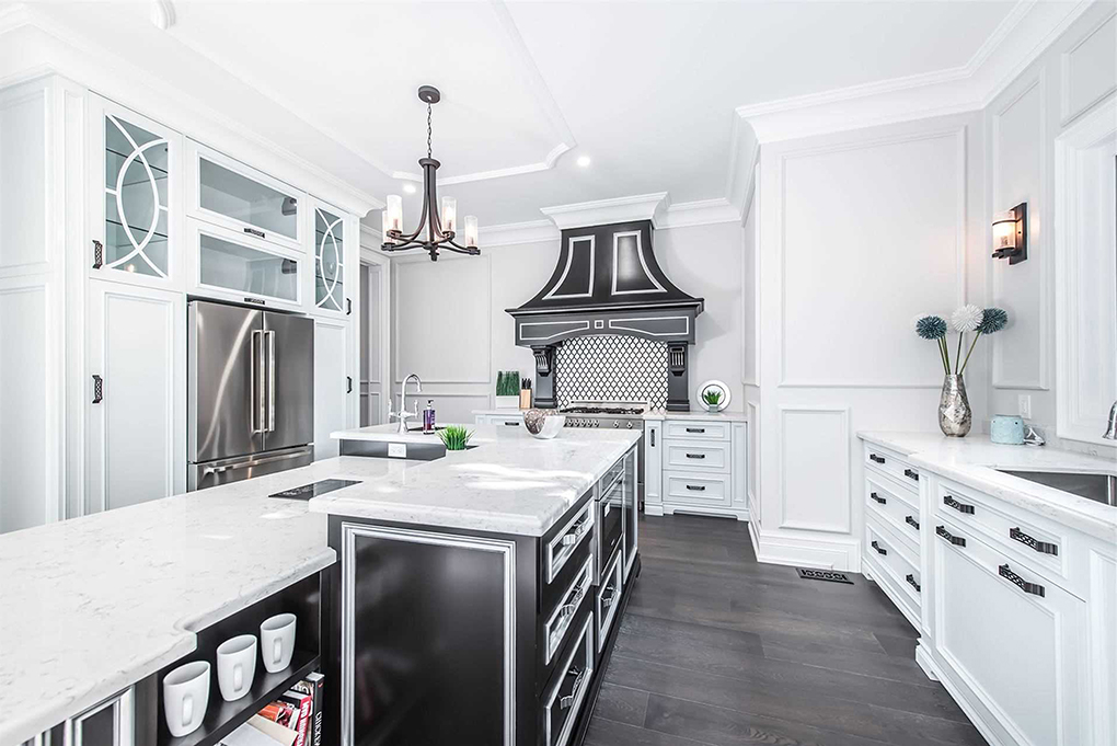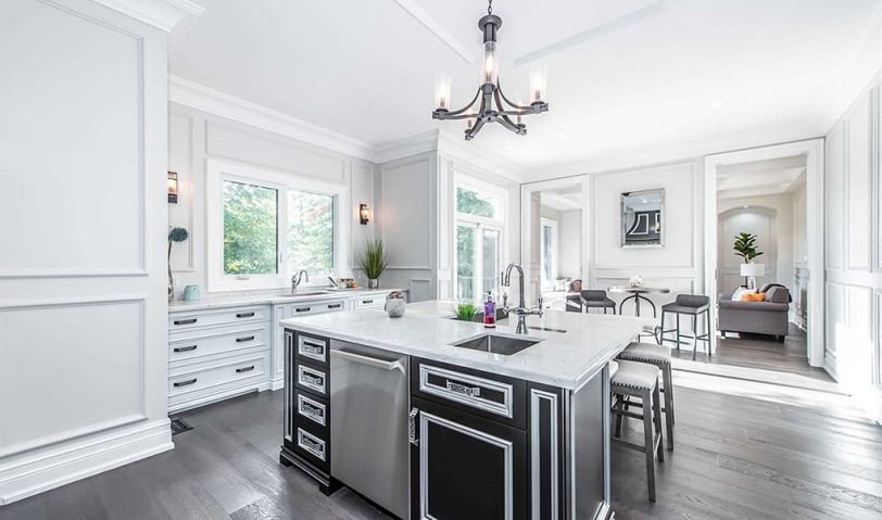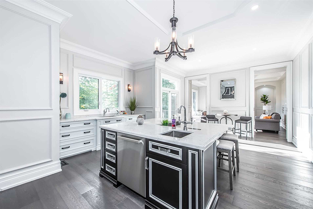 廚房餐廳整體以白色為主,歐式的櫥柜門板為整個空間帶來了高柜和典雅,黑色的把手、灰黑色的中島地柜以配色的方式增加了空間的精致感與高級感。