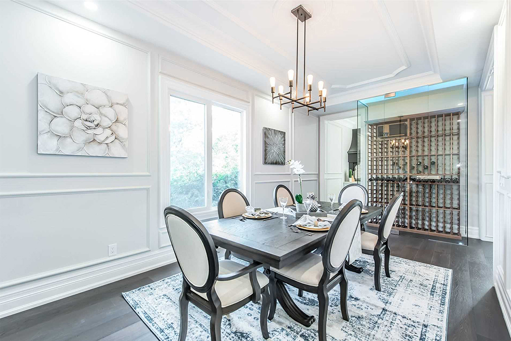 餐桌一旁的大窗戶保證了餐廳充足的采光,純白色的墻壁加木地板形成明顯的對比,更顯白色墻面的純凈素雅,回型的石膏線吊頂極具對稱美感,金色的吊燈和餐桌一旁的酒架也在彰顯著房間的格調(diào)和屋主的品味。