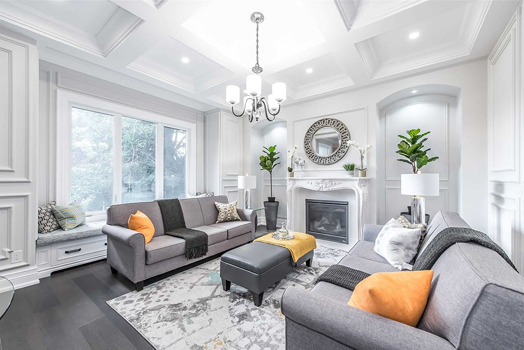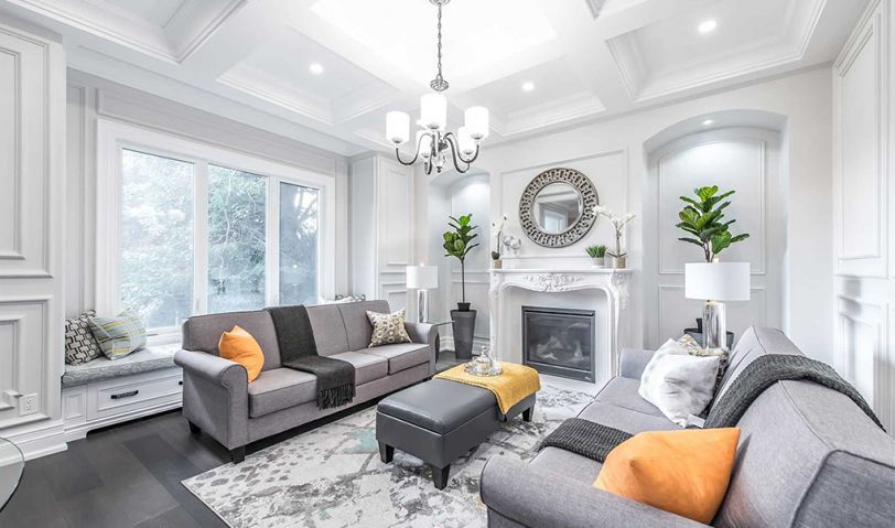 客廳的色調(diào)以白色+灰色為主,墻壁、飄窗柜和吊頂都有石膏線作為裝飾,極具歐式的復(fù)古格調(diào)。和大部分以電視背景墻和電視機(jī)為中心的客廳設(shè)計(jì)不同,設(shè)計(jì)師在客廳中設(shè)置了壁爐,在為整個空間帶來強(qiáng)烈的歐式風(fēng)格之外,其取暖功能也是非常實(shí)用的。
