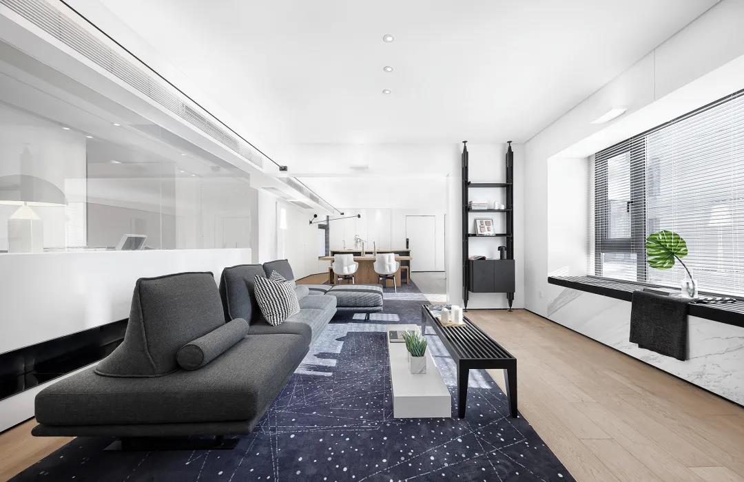 沙發(fā)下鋪就一塊帶有銀河光輝的地毯,從客廳延伸到餐廳。坐在沙發(fā)上如同踏步在璀璨的星河中,充分滿足了小孩子的好奇心和探索欲。