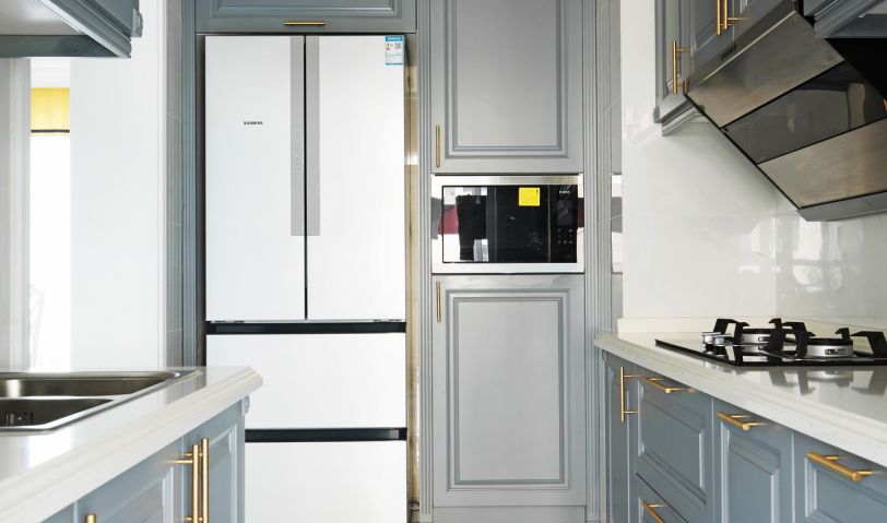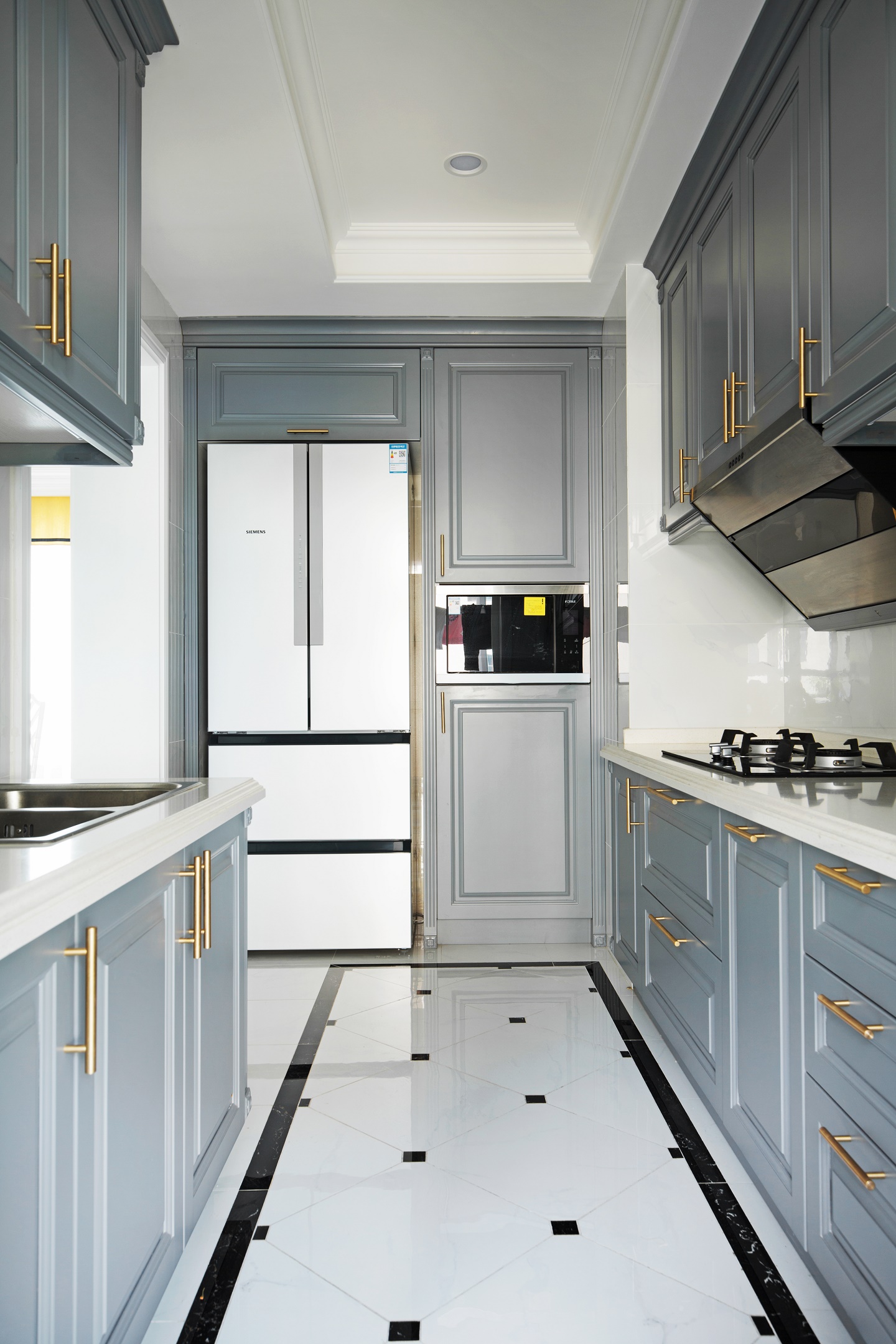 廚房空間中,櫥柜部分延續(xù)灰藍色調(diào),配以白色拋光磚及白色臺面,點綴金色五金件,使整個空間潔凈明亮又不失高雅。