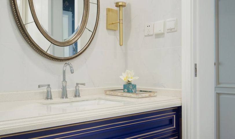 洗漱間的寶藍色浴室柜,搭配明黃色圖案壁紙,運用對比色使空間典雅、靈秀。