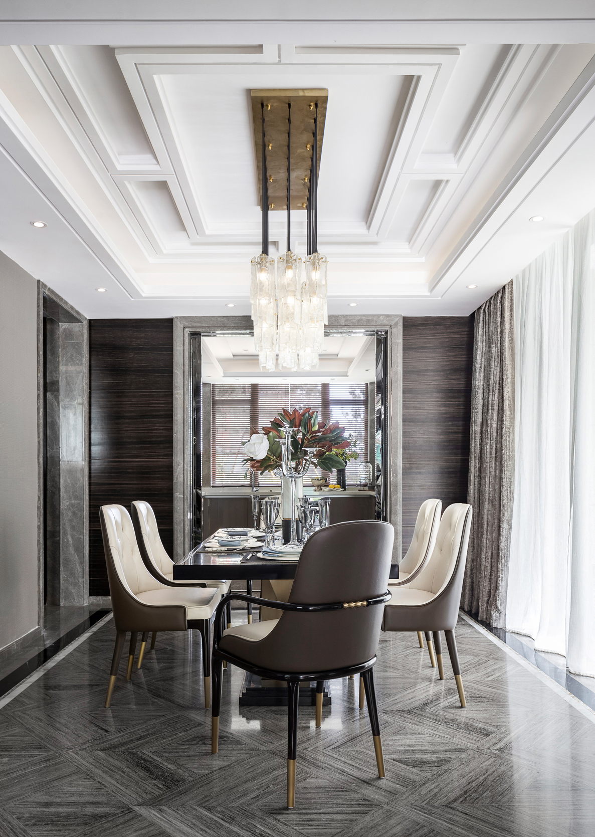 餐廳是分享美食、與家人情感交流的重要場域,造型穩(wěn)重的家具為空間注入一份恰到好處的儀式感,水晶燈下清透的餐具細節(jié)營造了明朗豁亮的用餐氛圍。